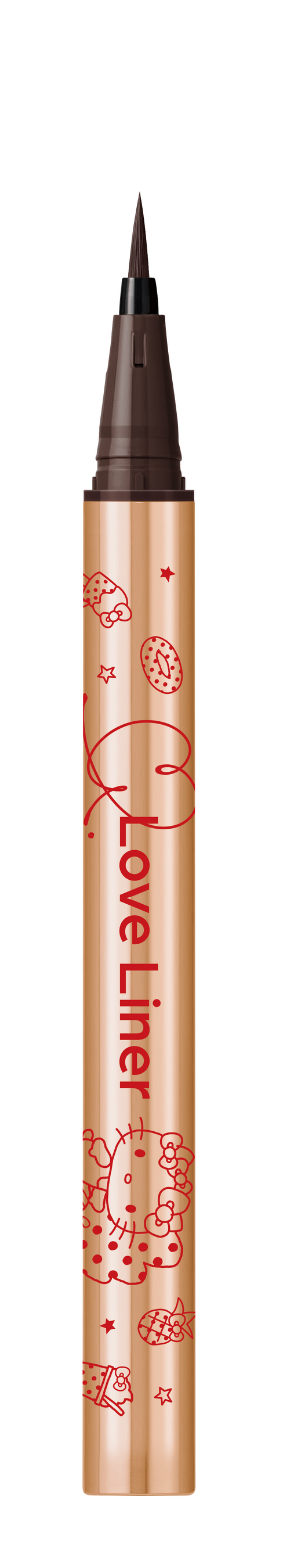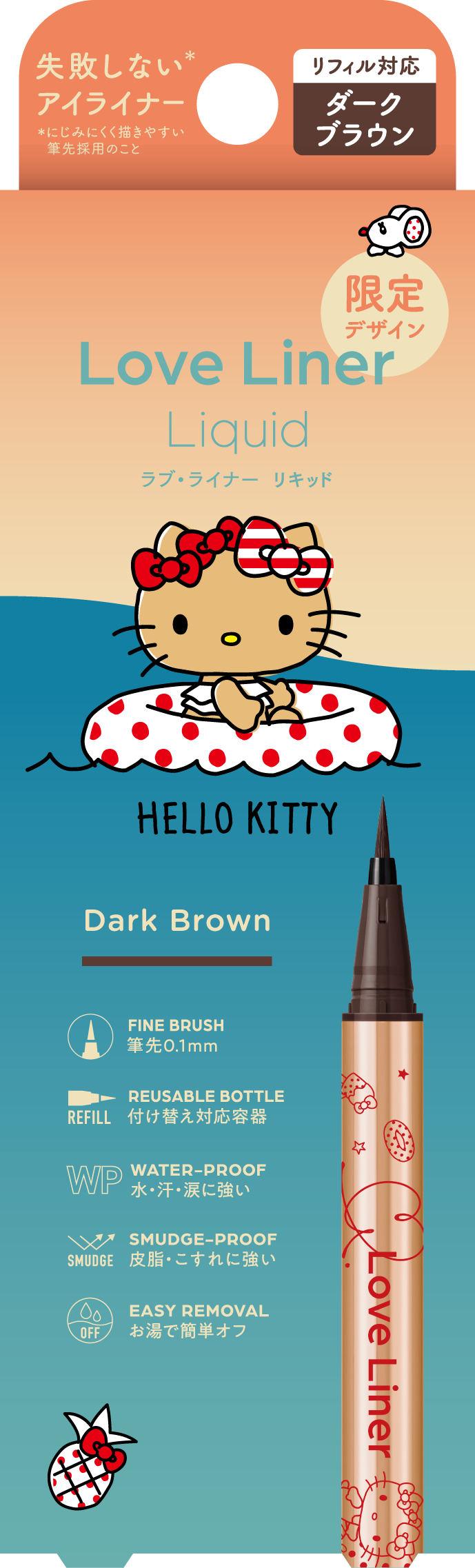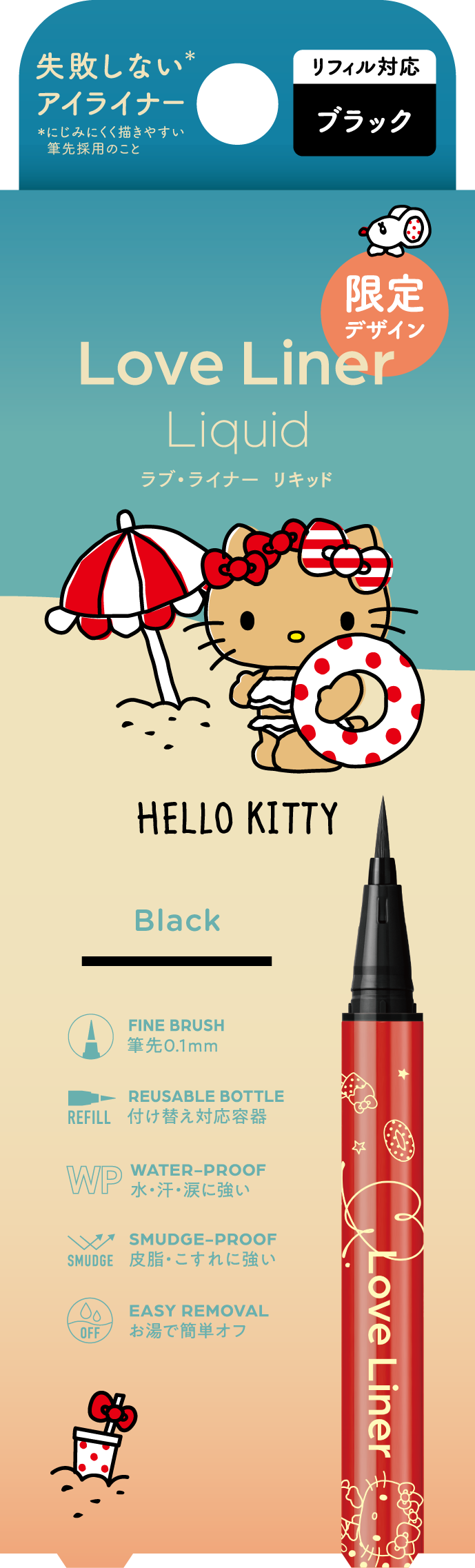 0.1mmの極細毛で細い線も太い線も自由自在。水・汗・涙に強いウォータープルーフ&皮脂・こすれに強いスマッジプルーフ仕様なのにぬるま湯で簡単にオフすることができるラブ・ライナーのリキッドアイライナー。今回は日焼けしたキティがバカンスを楽しむハッピーな姿が可愛い、心が躍るデザインです。
