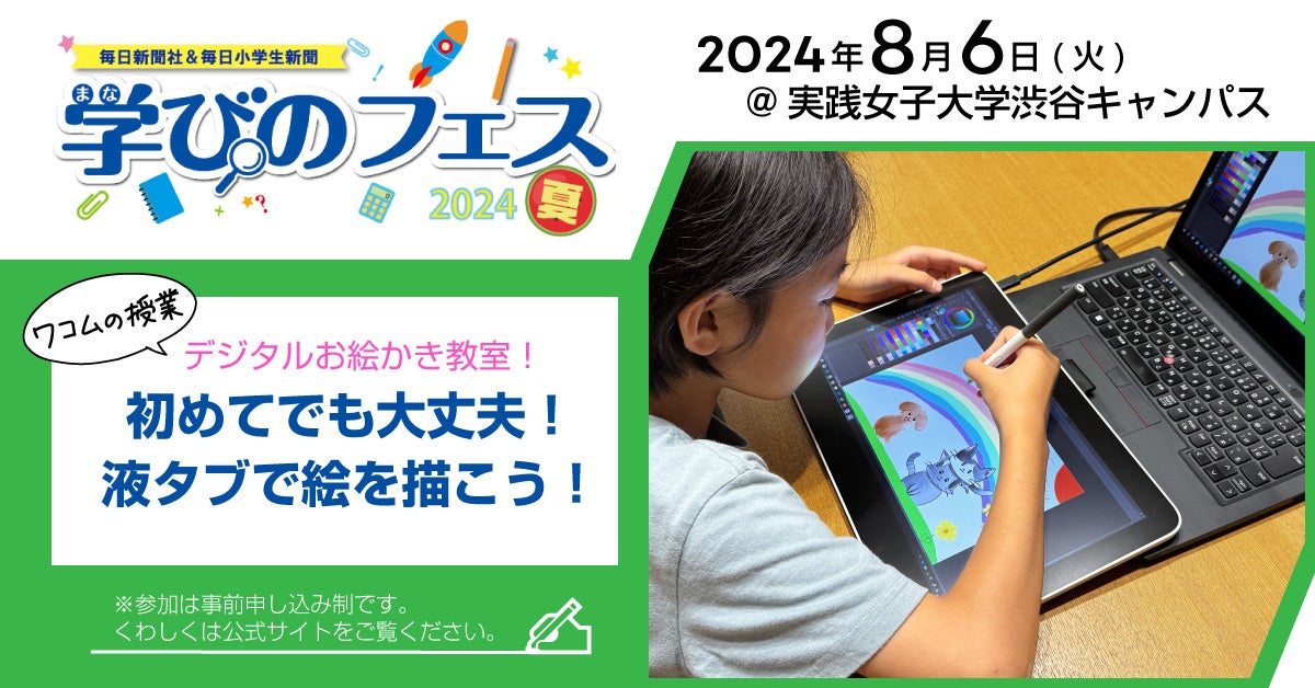 株式会社ワコムは、2024年8月6日(火)に実践女子大学渋谷キャンパスで開催される『学びのフェス2024夏 in 実践女子大学』(主催:毎日新聞社、毎日小学生新聞)に出展します。