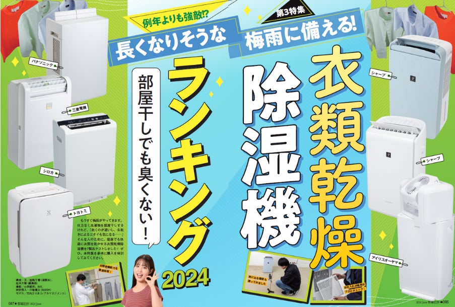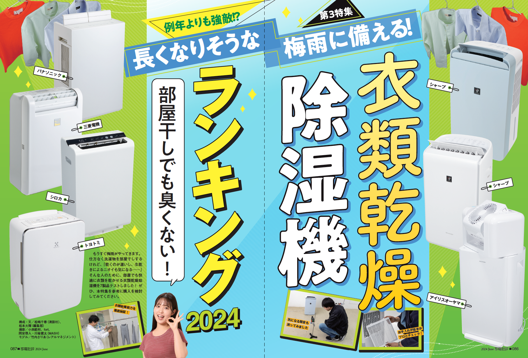 【家電批評6月号】今年の長い梅雨に備えて衣類乾燥除湿機や扇風機・サーキュレーターを徹底比較!お得なスマホ活用術も必見!!