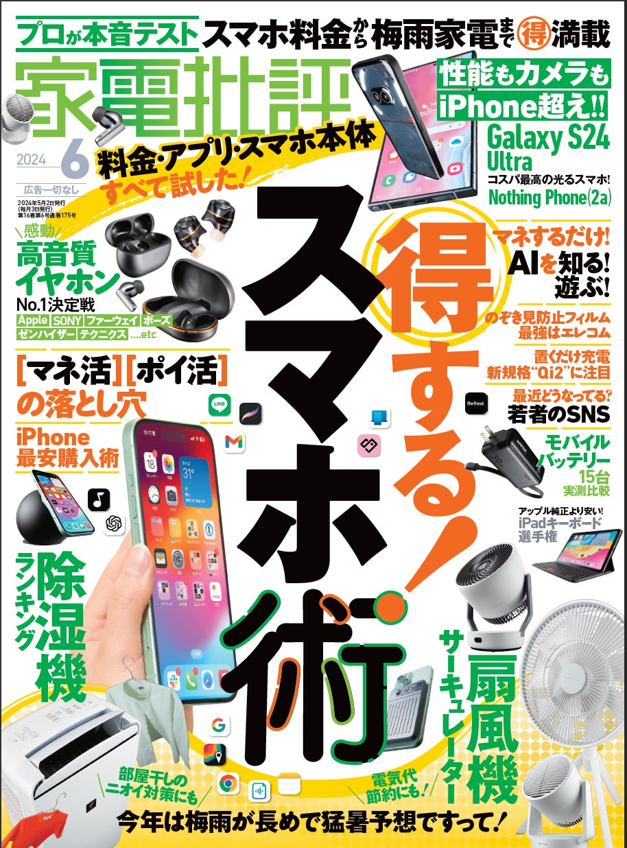 さらに詳しい比較テスト結果やベストバイに選出した理由は誌面(家電批評24年6月号)をチェック! 晋遊舎のプレスリリースでは、今後も『家電批評』発行日に合わせて「BEST BUY」受賞アイテムを発信します。 お楽しみに!