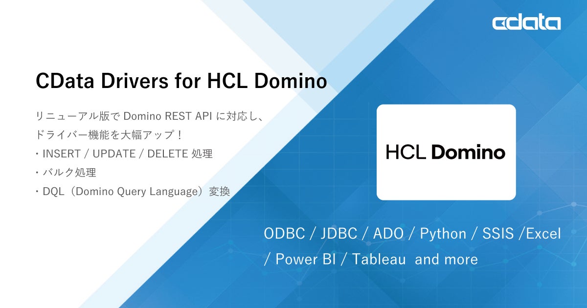 2024年6月12日、CData Software Japan 合同会社(本社:アメリカノースカロライナ州、日本オフィス:宮城県仙台市、代表社員 職務執行者:疋田 圭介、以下CData)は、HCL Domino データに各種BI・データ連携・ノーコードツールからのアクセスを実現する『CData Drivers for HCL Domino』においてHCL Domino REST API に正式対応しました。これにより、HCL Domino への書き込み処理、バルク処理、Domino Query Language(DQL)への対応など大幅な機能追加を実現しました。HCL Domino ユーザーが、さまざまなツール・アプリケーションからHCL Domino データにより簡単にアクセス可能になるとともに、多くのデータ処理を行うことが可能になり、Domino データの活用を促進さることができます。