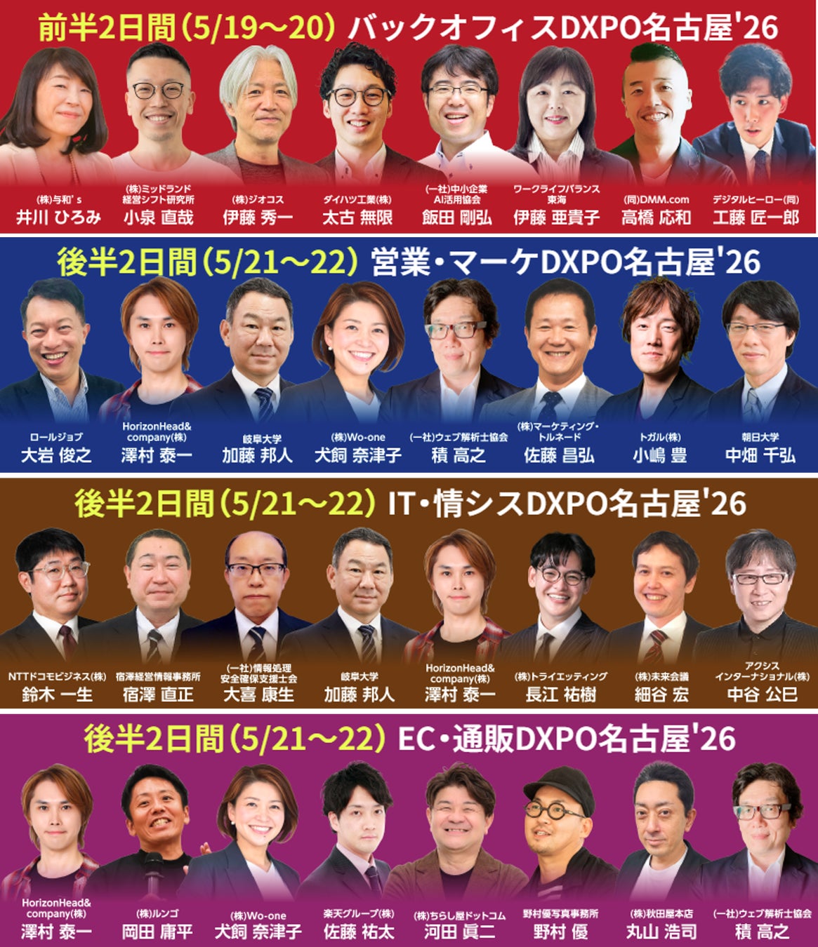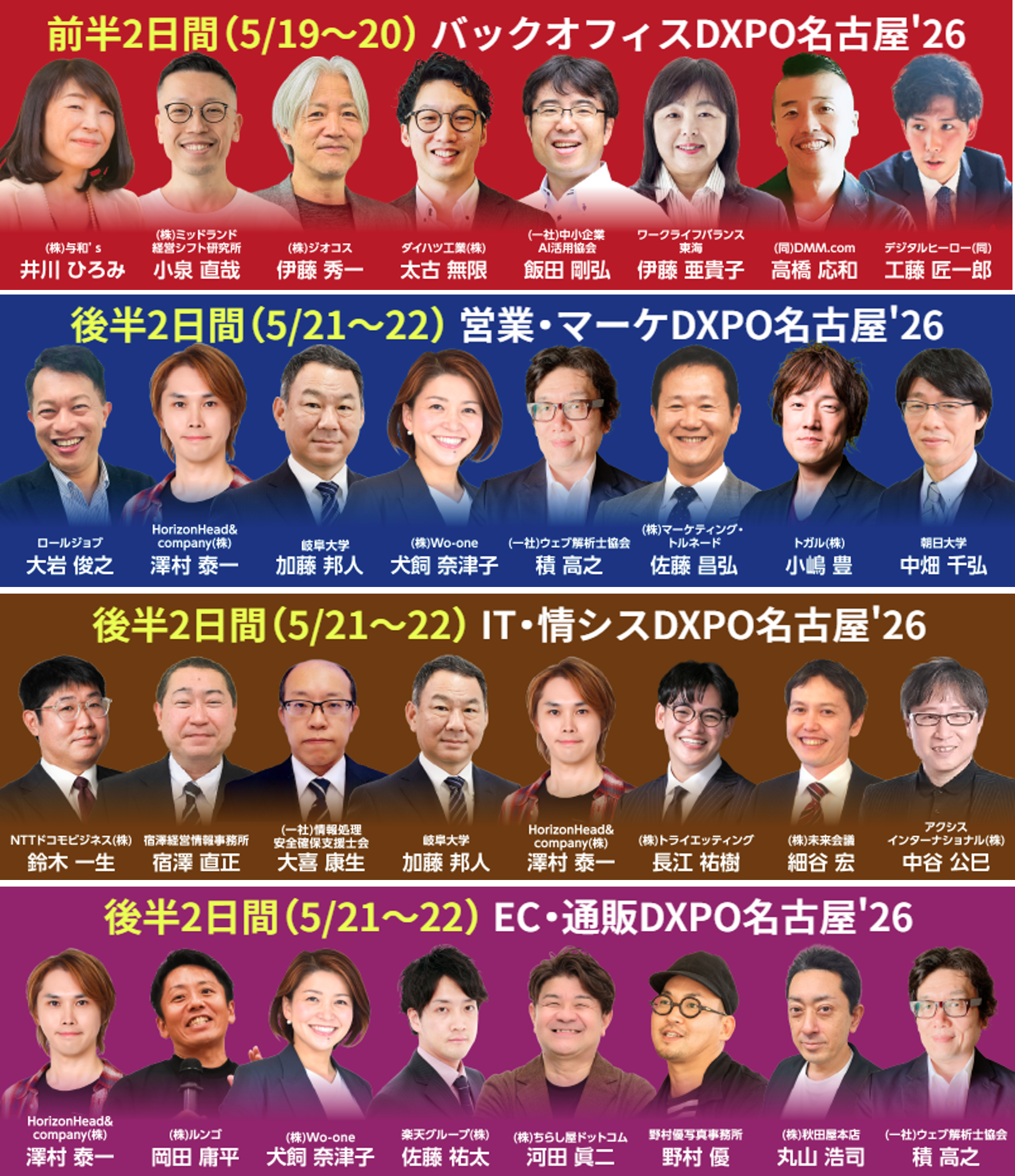 バックオフィス/【管理部門】AIエージェントDXPO名古屋'26では、社内外でDXやAIの推進活動に努めるダイハツ工業(株) 太古無限氏が登壇。営業・マーケ/【営業・マーケ・DX推進】AIエージェント/IT・情シス/EC・通販DXPO名古屋'26では、マーケティングやSNSの豊富な知見を持つ(一社)ウェブ解析士協会 積高之氏、豊田市にてCDO補佐官を務めるNTTドコモビジネス(株) 鈴木一生氏、楽天グループ(株)で全国の新規出店コンサルタントを統括する佐藤祐太氏が登壇。この他にも、本分野の第一線で活躍する方々を講師にお迎えし、全40セッションを開催する。あらゆる業種・企業・法⼈のビジネスパーソン必⾒のセミナープログラムだ。