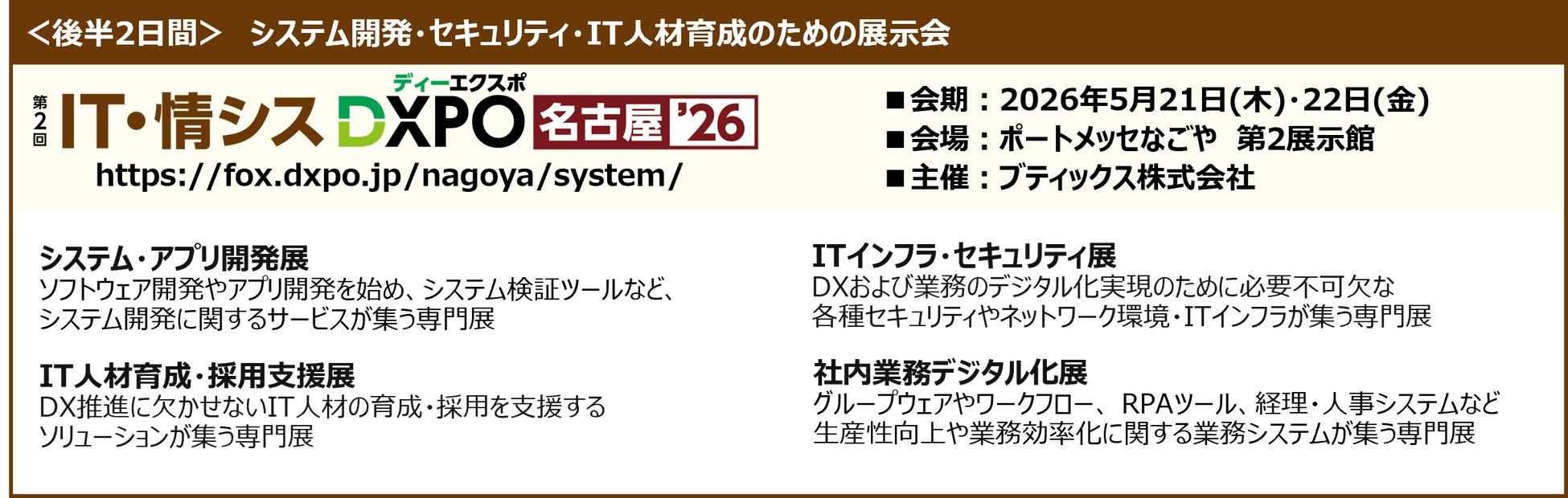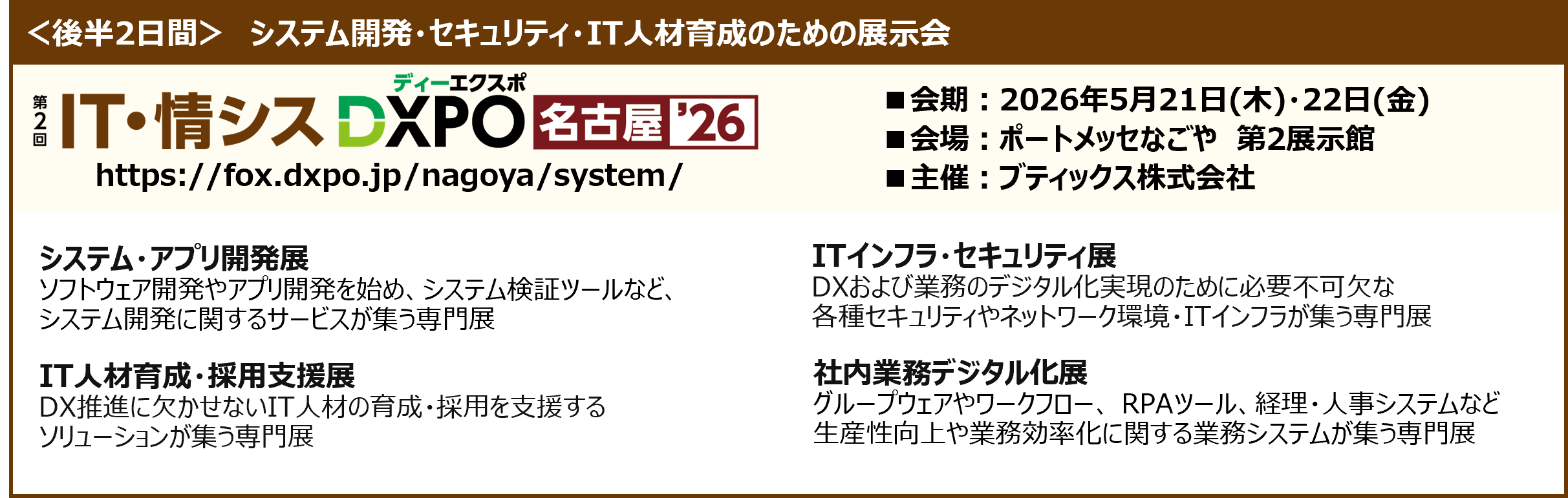 システム開発・セキュリティ・IT人材育成のための展示会である。「システム・アプリ開発展」「ITインフラ・セキュリティ展」「IT人材育成・採用支援展」「社内業務デジタル化展」の4つの専門展で構成され、システム開発・運用・保守、セキュリティ対策、IT人材育成を支援する注目の製品・サービスが一堂に出揃う。