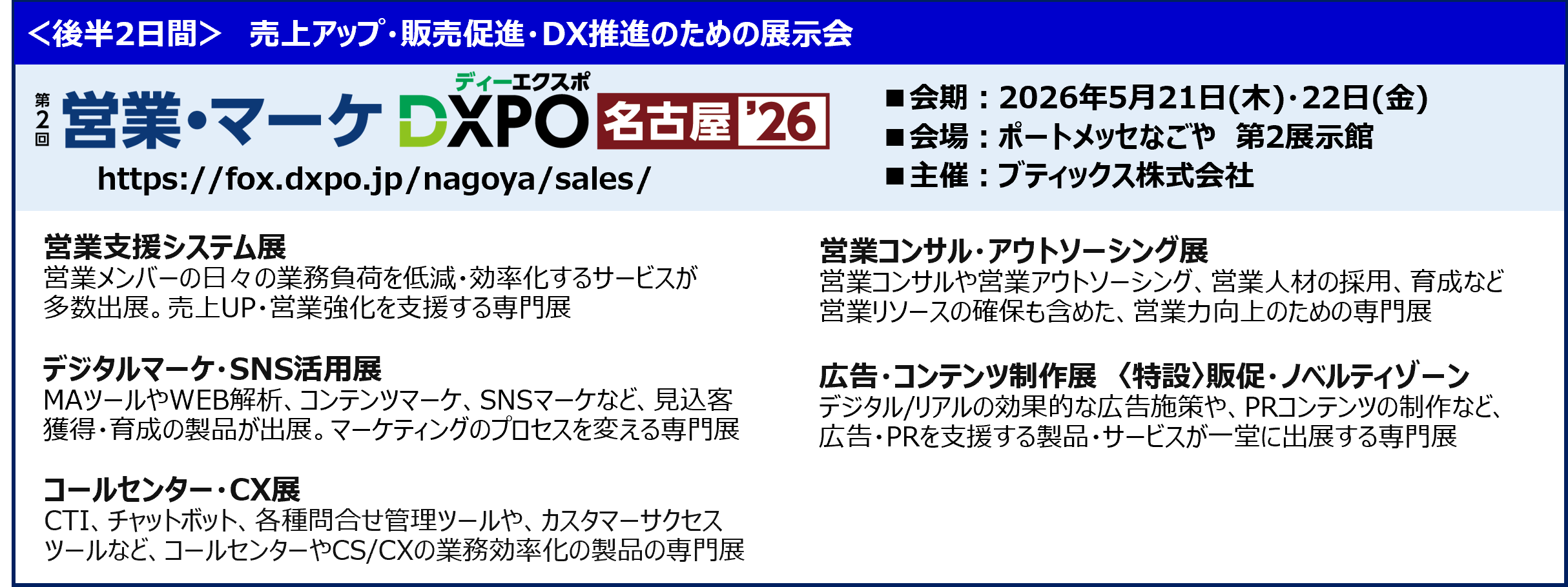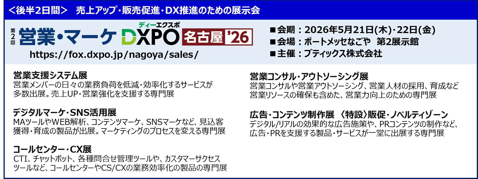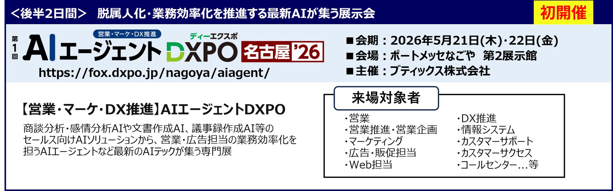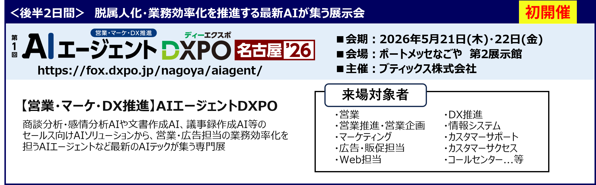 ●第1回 【営業・マーケ・DX推進】AIエージェントDXPO名古屋’26<初開催>