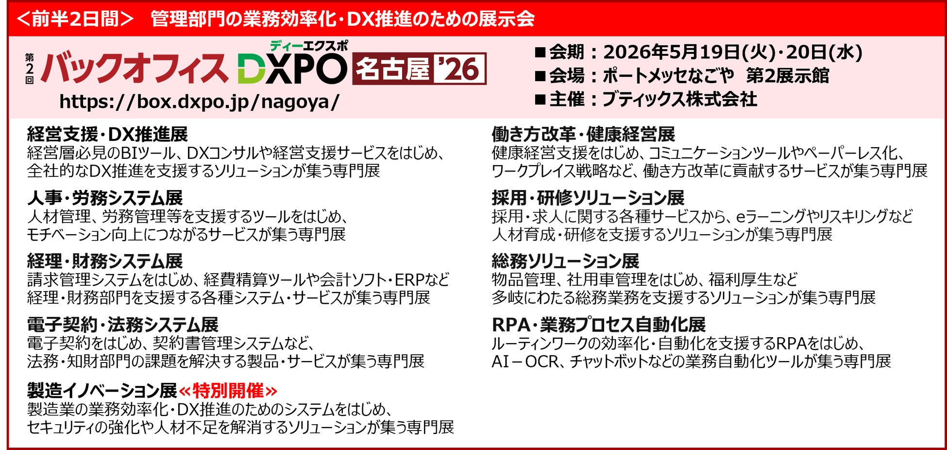展示会事業、M&A仲介事業、人材採用支援事業を展開する、ブティックス株式会社(東京都港区、代表取締役社長 新村祐三、東証グロース上場 証券コード:9272)は、今年5月、ポートメッセなごやにおいて初開催のAIエージェントDXPOを含めた下記6つの展示会を同時開催する。
