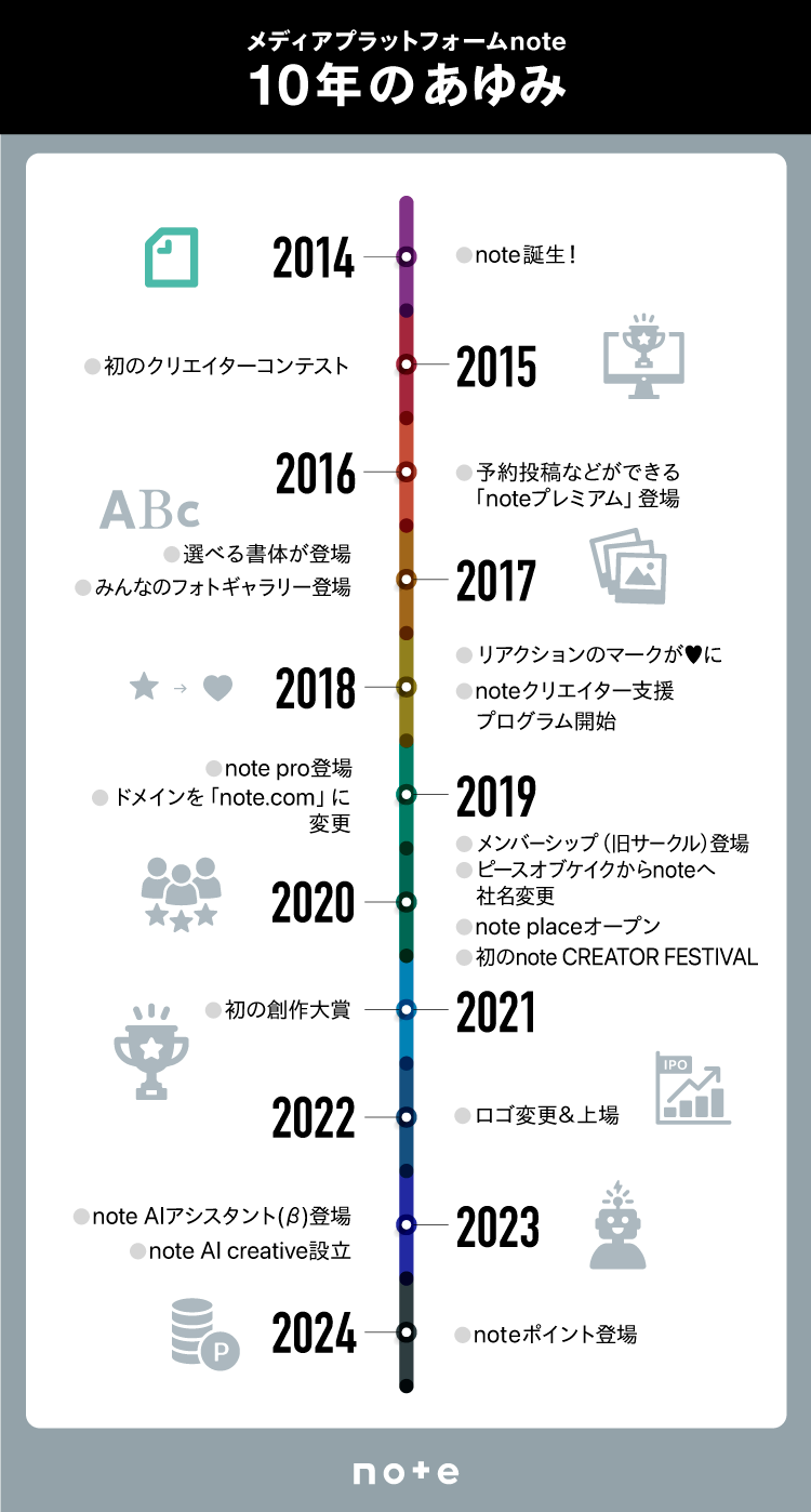 noteのサービス開始10周年を記念して、クリエイターエコノミーの成長とそれに伴う情報発信やコミュニケーションの変化をまとめました。以下、主なトピックスです。