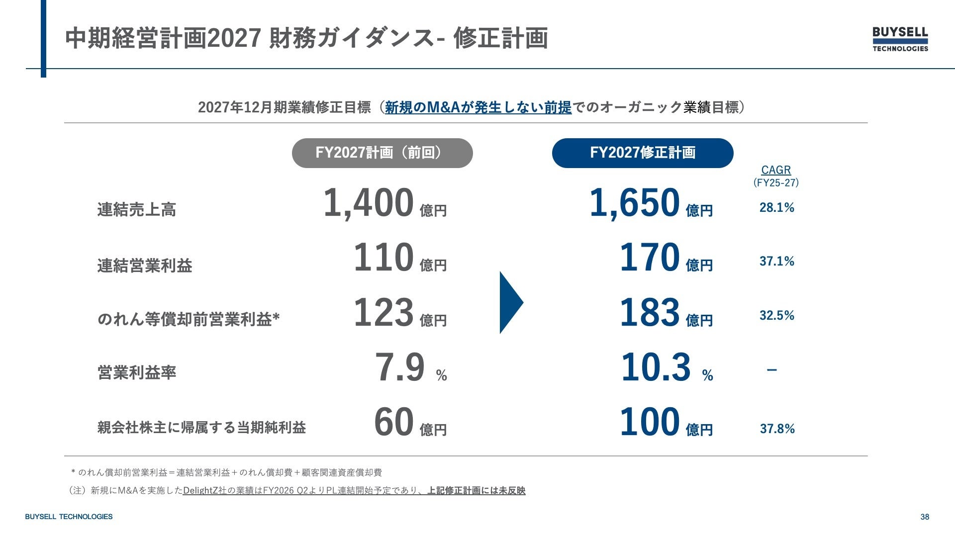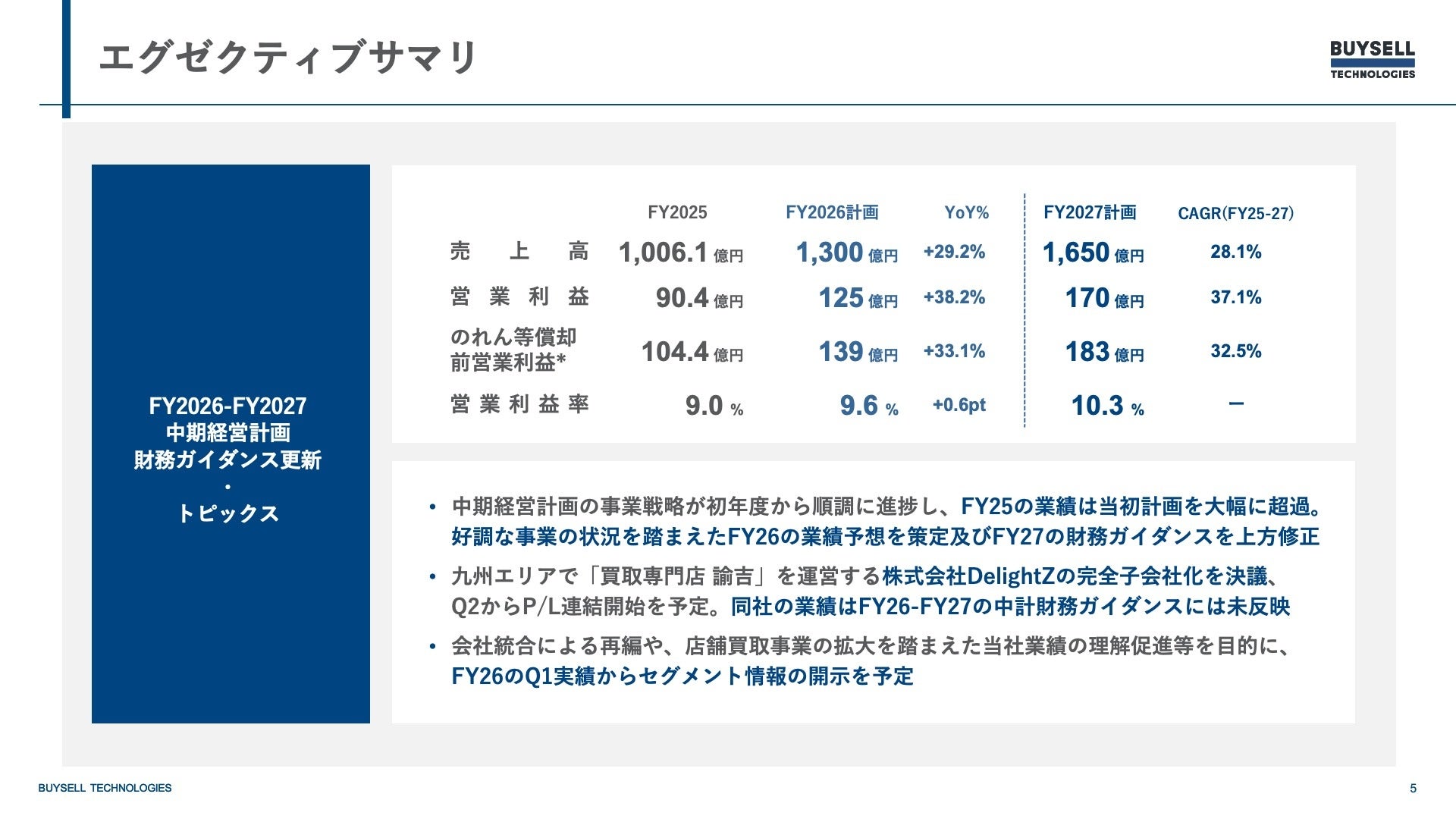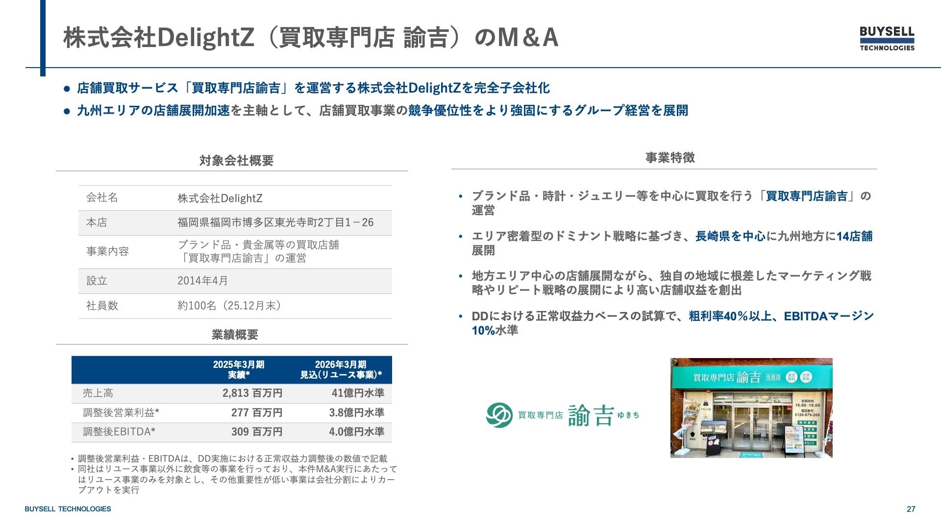 また新規のM&Aとして、九州エリアで「買取専門店 諭吉」を運営する株式会社DelightZを完全子会社化いたします。第2四半期からP/L連結を開始予定であり、2026-2027年度の財務ガイダンスには未反映です。