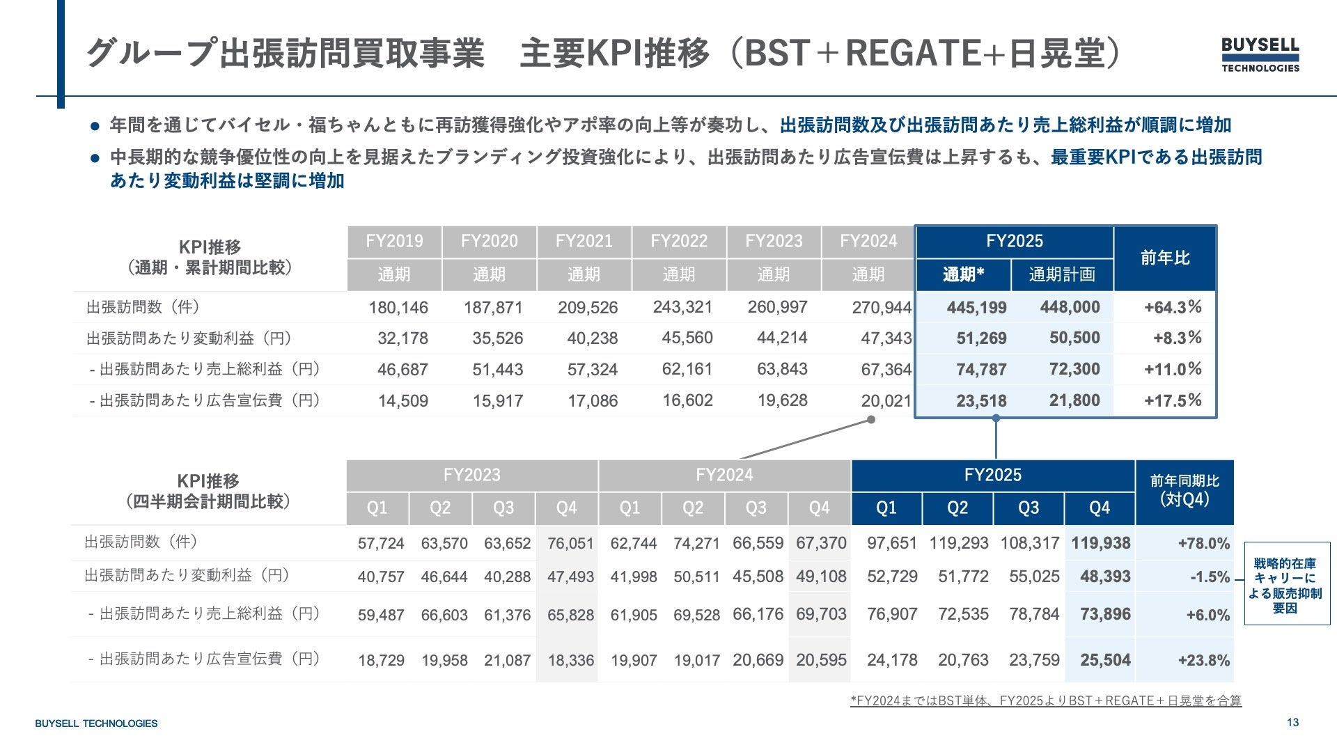 年間を通じてバイセル・福ちゃんともに再訪獲得強化やアポイントメント率の向上等が奏功し、出張訪問数及び出張訪問あたり売上総利益が順調に増加。