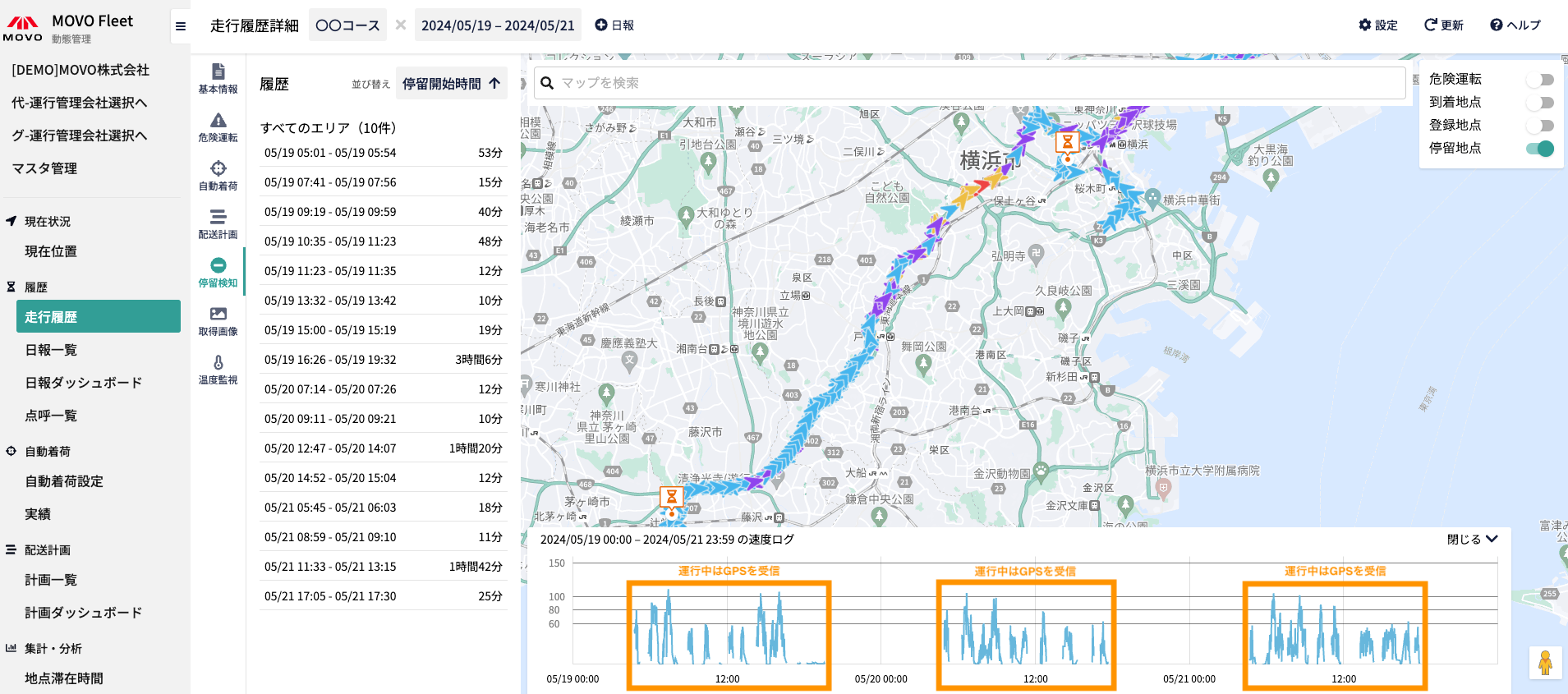 本システムは、ドライバーが積み降ろしの場所に到着・出発するタイミング、およびその他の場所での停留時間を自動的に判定します。