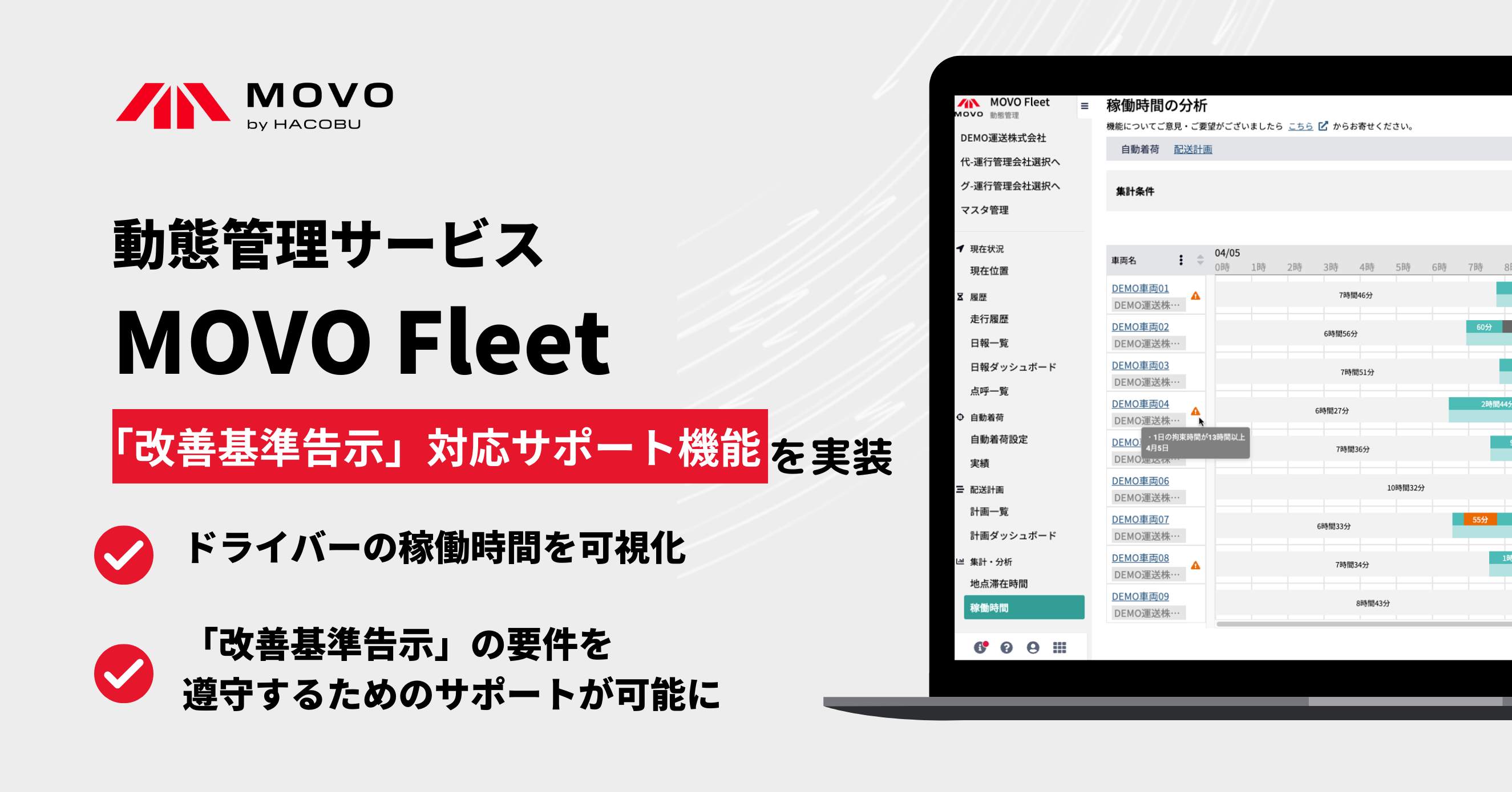 ドライバーの稼働時間を、即可視化!Hacobu、動態管理サービスで「改善基準告示」対応サポート機能をリリース