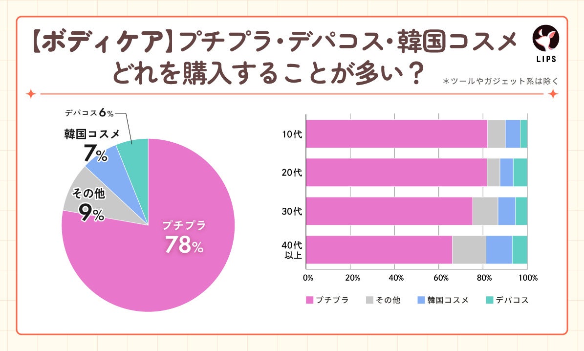 ヘアケアに続き、ボディケアアイテムも全体・各世代ともに圧倒的に「プチプラ」支持が高い結果に。