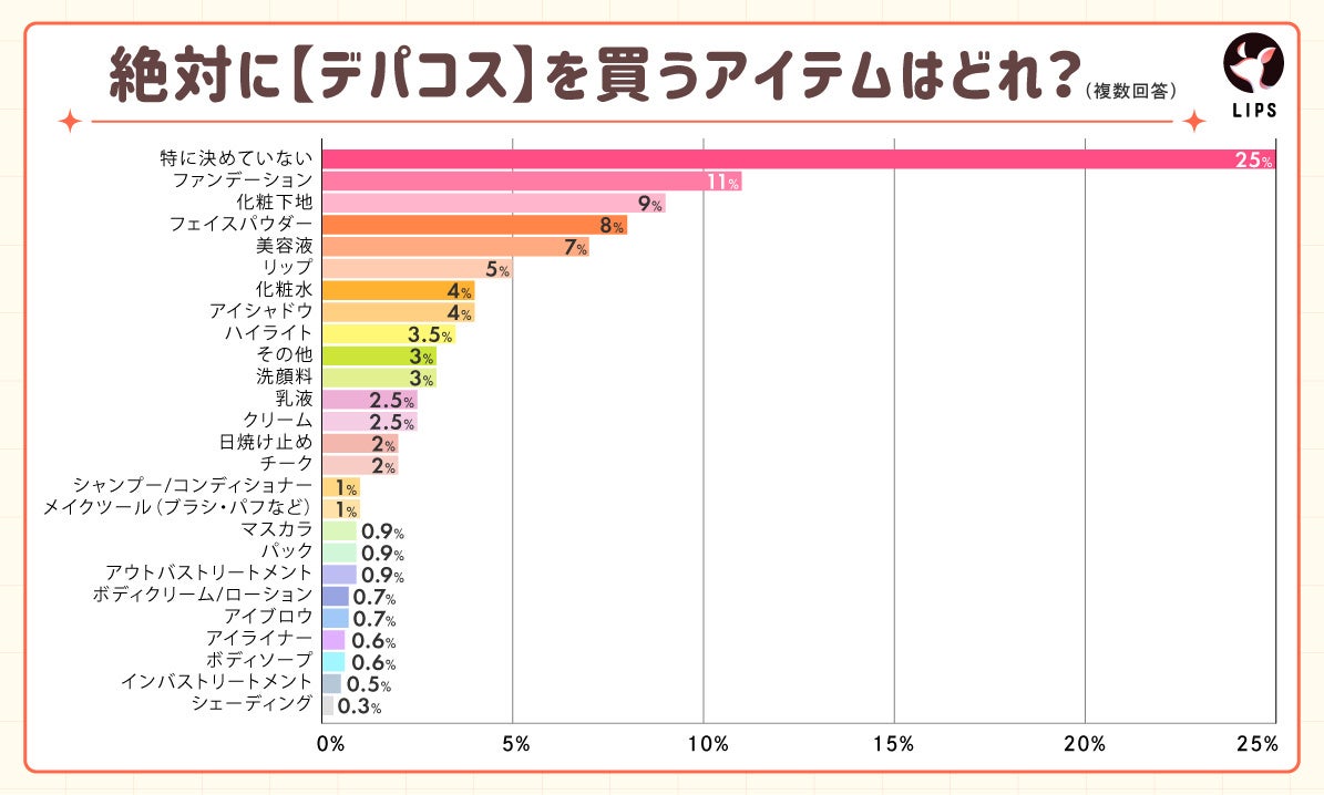 「デパコス」は「特に決めていない」への回答率が高いものの、やはり「ファンデーション」「化粧下地」「フェイスパウダー」といった、ベースメイクのメインアイテムが強い結果に。また、「美容液」や「化粧水」などのスキンケアアイテムも購入率が高くなっており、肌管理の意識やキレイなベースを作りたいというニーズが現れていました。