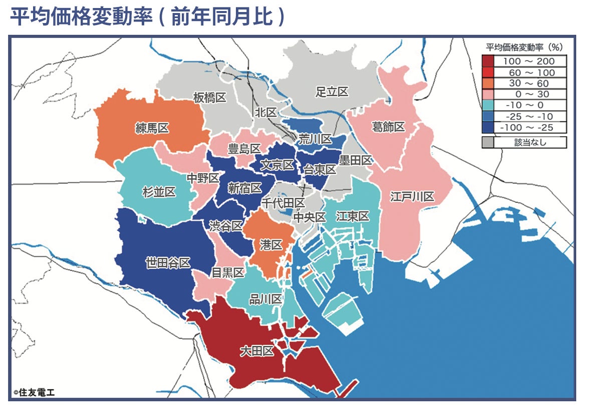 地図の各行政区ごとの色の違いは、同行政区における平均価格の前年同月比(平均価格変動率)の程度を表しています。