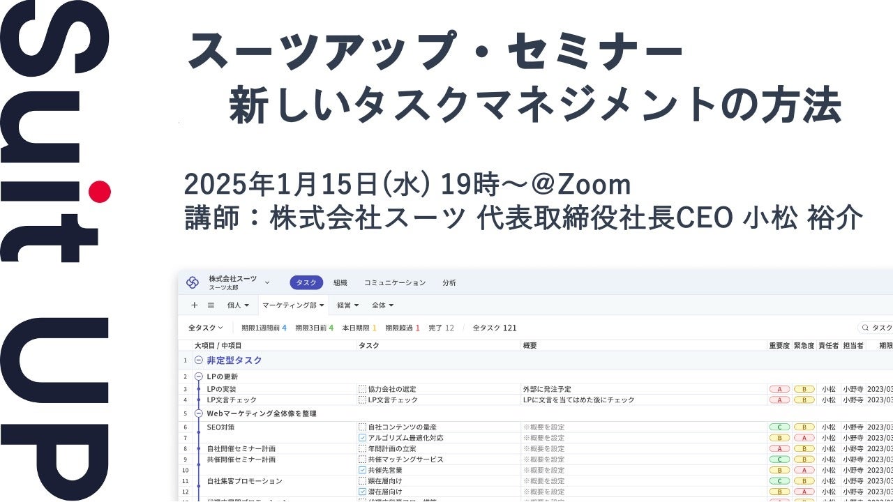 株式会社スーツ(所在地:東京都千代田区、代表取締役社長CEO:小松 裕介)は、2025年1月15日(水)19時から、当社代表の小松が講師を務めるスーツアップ・セミナー「新しいタスクマネジメントの方法」を無料開催します。