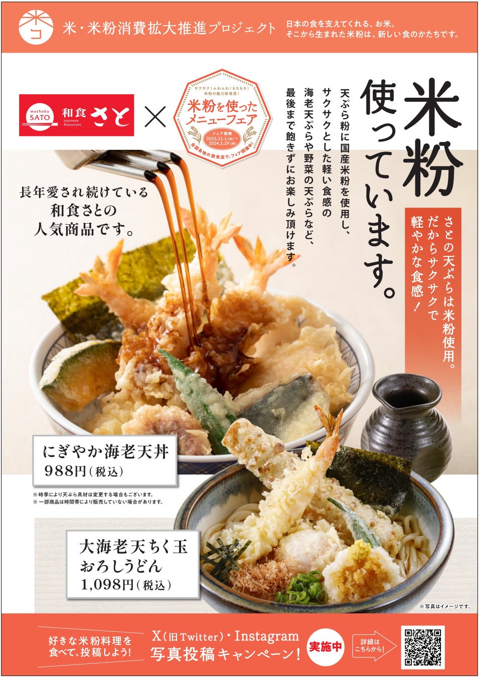 和食さとは「米粉」入り天ぷら粉を使用した商品として、「にぎやか海老天丼」や「大海老天ちく玉おろしうどん」などの人気の天ぷらメニューを全店で販売しており、米粉の消費拡大の推進に賛同し今回参画します。
