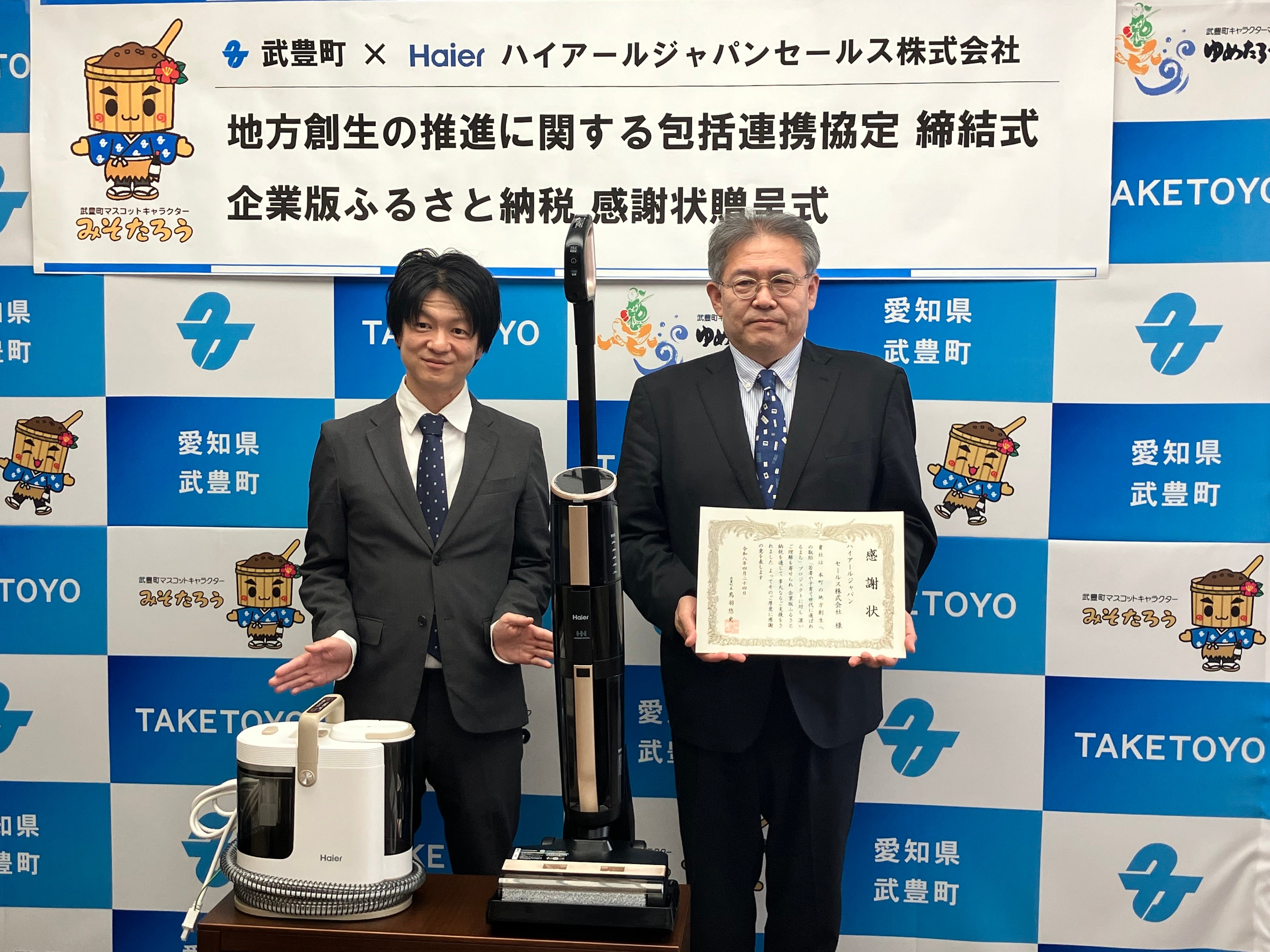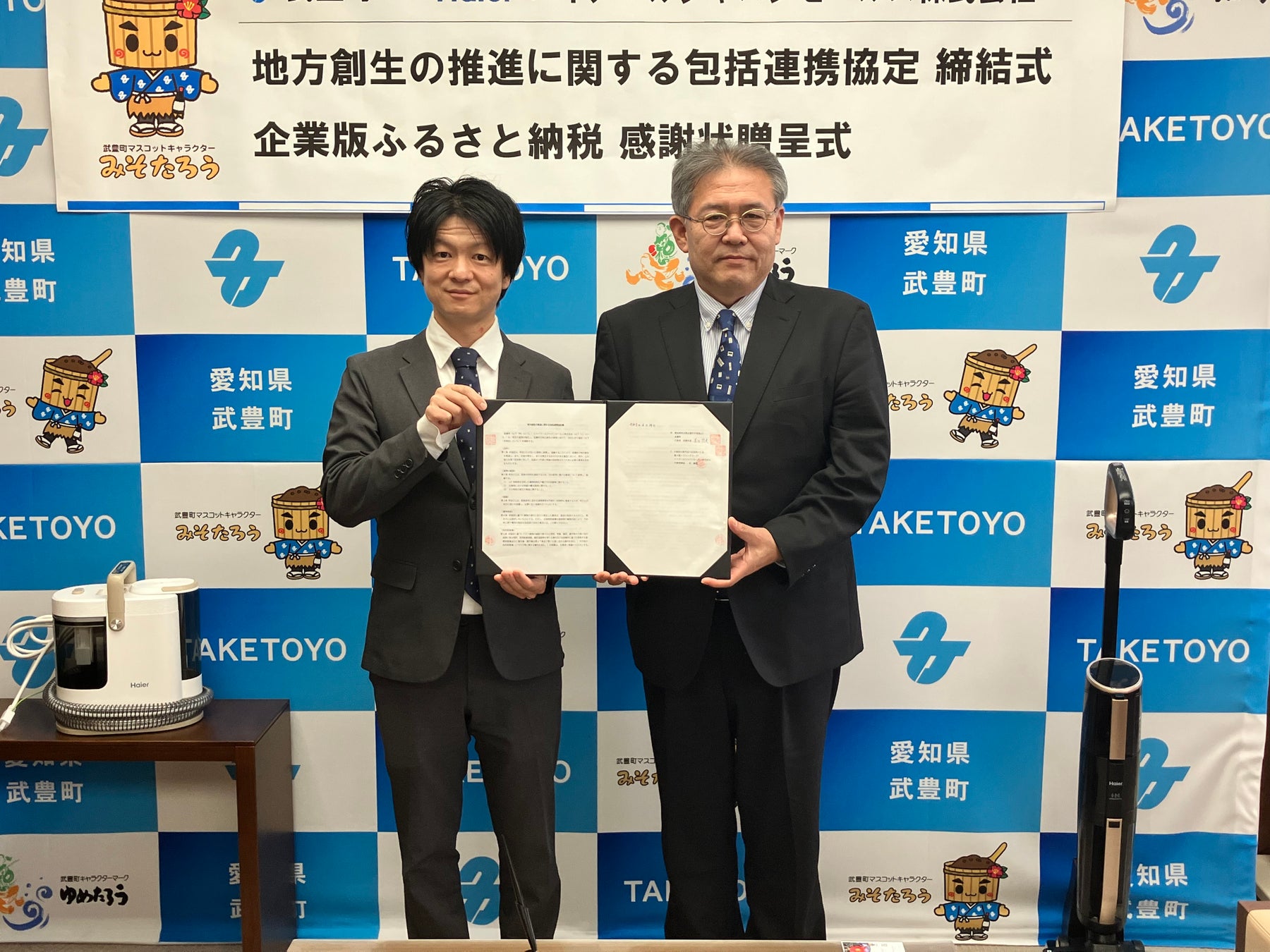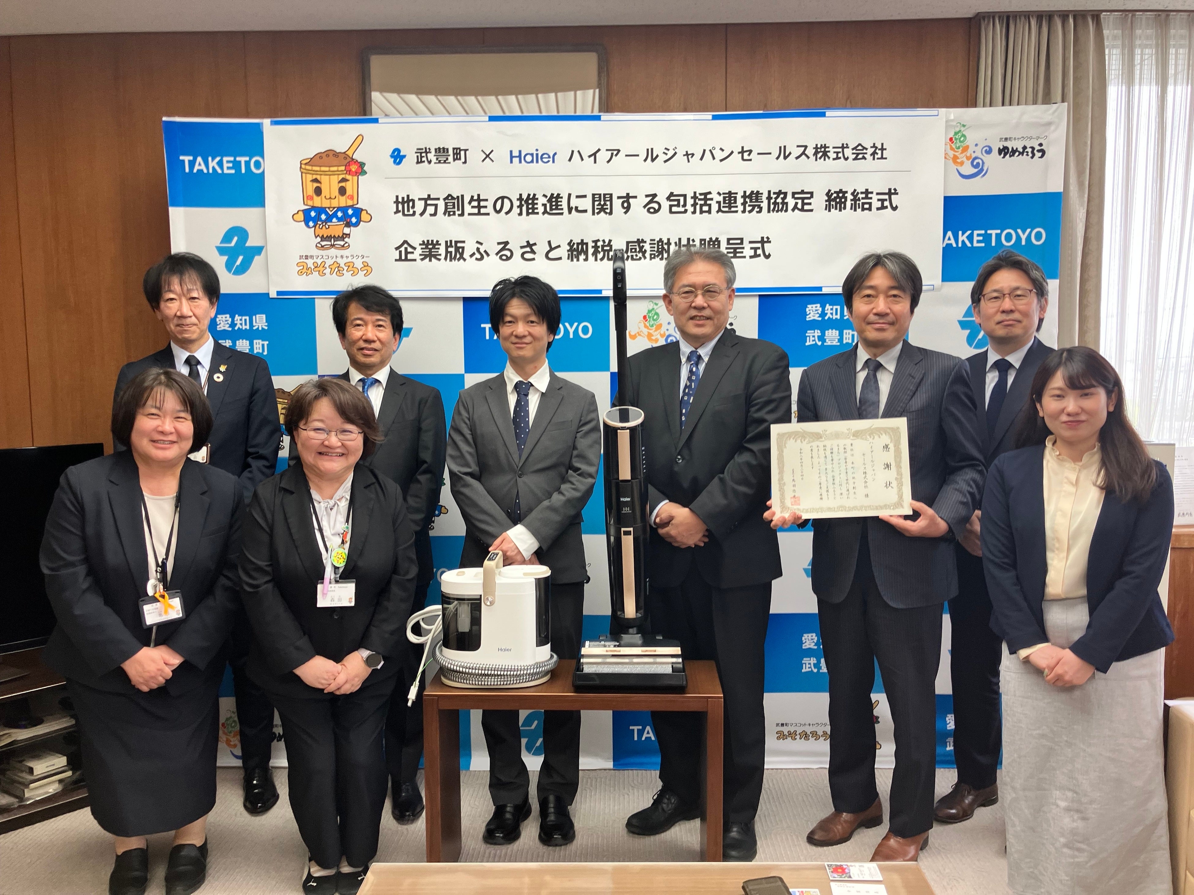 ハイアール ジャパン セールス株式会社と愛知県武豊町は、福祉・環境・防災・まちづくりなど地域が抱える様々な課題に対し相互の連携を強化し、武豊町の地方創生を推進するとともに、地域社会のさらなる発展を図り、災害時には迅速かつ円滑な物資供給を実現することを目的に包括連携協定を締結します。また、複数の保育施設へ吸引式床拭き掃除機「MIZUKI」(JC-M1A)と、布製品水洗い掃除機「MIZUKI nu-no」の温水スチームモデル(JC-RPS1A)、児童館へ5.0㎏全自動洗濯機(JW-U50C)等を寄贈し、こども園等での活用・業務の効率化や環境衛生管理の改善を図れるようにすることで、子どもたちが衛生的な環境で過ごせるだけでなく、保育士の労務改善を図り、武豊町の子育て支援を推進できるようにしていきます。