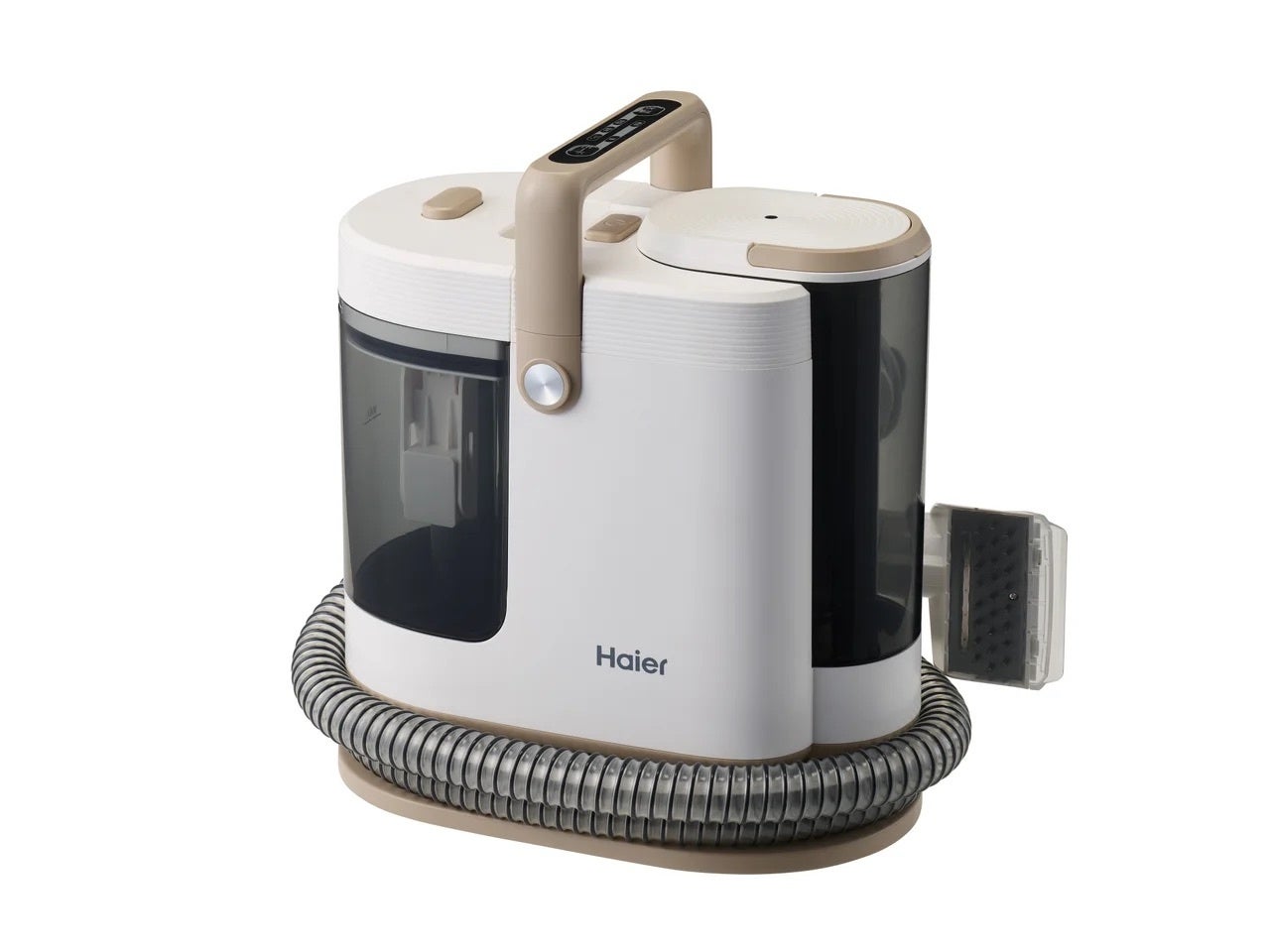本製品は、タンクに入れた水をノズルから噴射し、布製品に染み込んだ汚れを浮かせます。そして浮き上がった汚れをブラシがかき出し、最大15,000Pa の力で吸引することで、ソファやカーペット、ベビーカー、車のシートなど、これまで洗うことが難しかった布製品を、布の表面から繊維の奥まで、しっかり洗浄します。