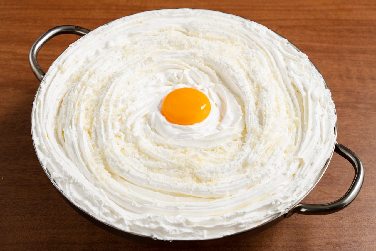 スタッフが出来立てのラッポギの上に、お客様の目の前でクリームを絞って仕上げます。見た目も味もインパクトがある一品です。
