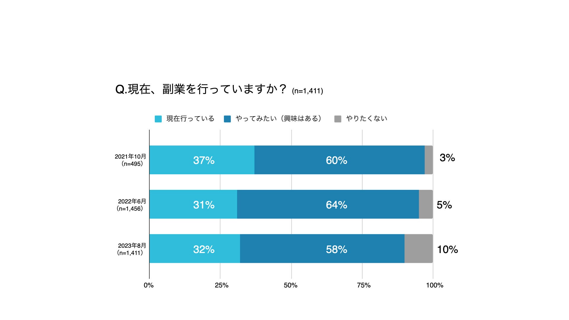 前々回(2021年10月実施)と、前回(2022年8月実施)、そして今回の調査結果において、副業意欲に関する回答の割合を比較すると「現在行っている」の回答者は、37%→31%→32%とほぼ横ばいの結果に。