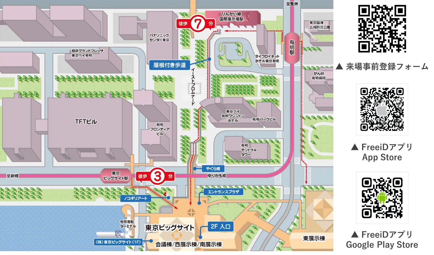 来場に際して事前登録頂くとスムーズにご入場頂けますので是非ご登録ください。また、事前にFreeiDアプリをダウンロードの上、会員登録も頂くとスムーズに顔認証もご体験頂けます。