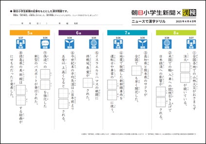 株式会社朝日学生新聞社(東京都中央区)が発行する「朝日小学生新聞」と、公益財団法人 日本漢字能力検定協会(京都市)は、漢字問題にチャレンジしながらニュースのおさらいができるワークシート「ニュースで漢字ドリル」を共同で開発しました。4月4日から毎週金曜日に配信します。(2026年3月27日まで)