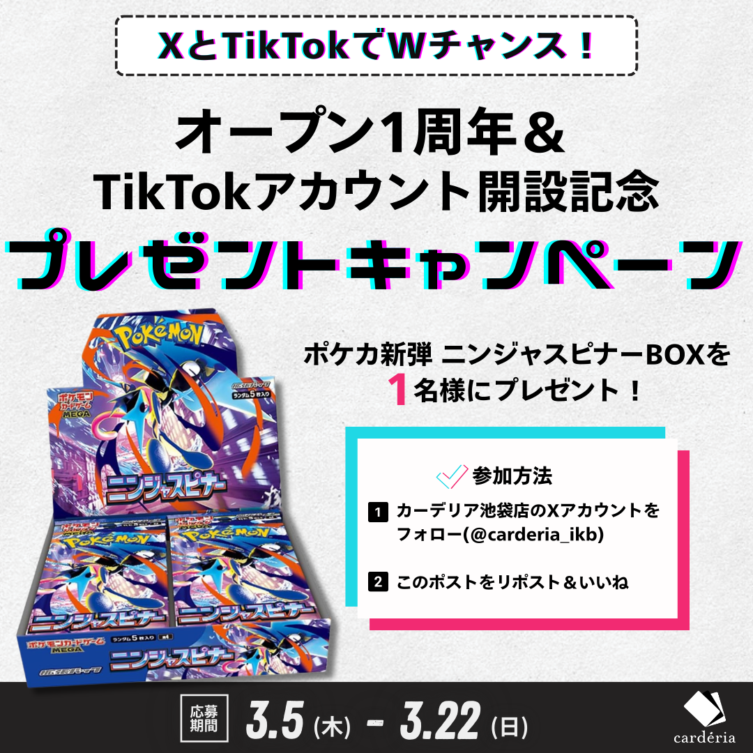 アクセルマーク株式会社(本社:東京都中野区、代表取締役社長:松川裕史、証券コード:3624)が運営するcardéria™は、TikTok公式アカウント(https://www.tiktok.com/@carderia_ikb)を開設いたしました。2026年3月5日より、店舗の魅力やトレーディングカードの楽しさを伝える動画配信を開始し、アカウント開設を記念したプレゼントキャンペーンも実施いたします。