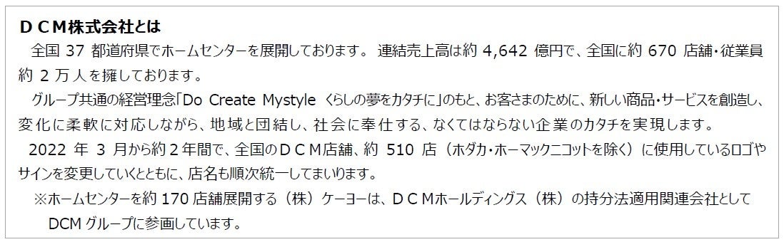 DCMは2022年3月からは、地域ごとに親しまれてきました店舗の看板やサイン等のロゴマークを「DCM」に順次変更するとともに、店名も「DCM」に統一し、これまで以上にお客さまに寄り添い、地域で信頼される店をめざしてまいります。
