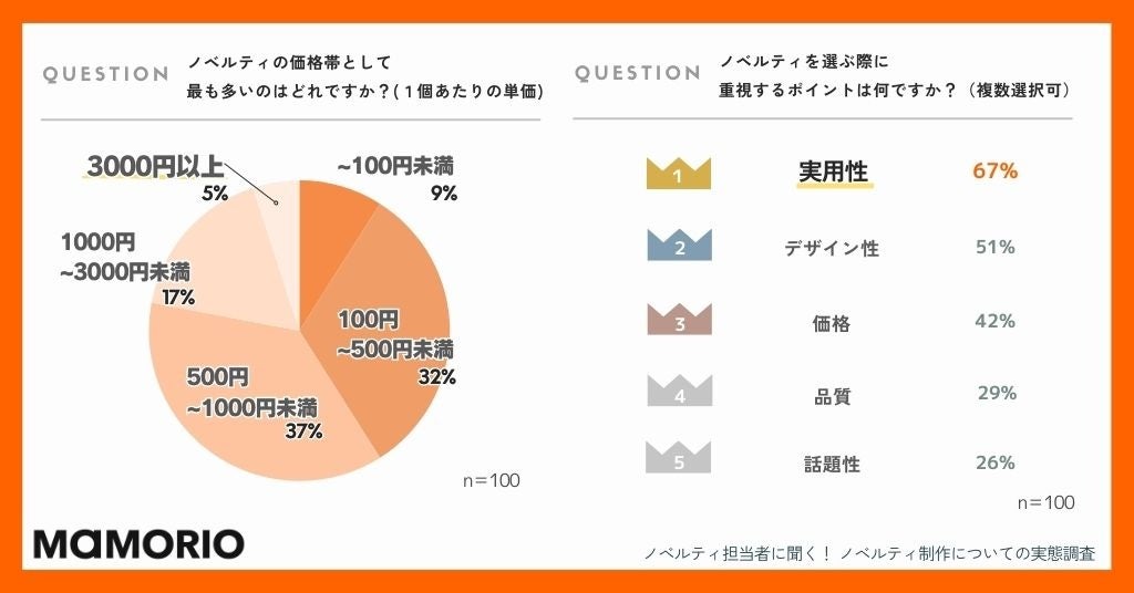 一方で、極端に安価な100円未満のノベルティは9%と少数にとどまる一方、1000円以上のノベルティも一定の需要が見られます。
