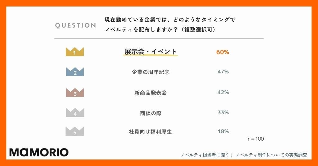 まず、各企業がどのようなタイミングでノベルティを配布しているのかを把握するため、「現在勤めている企業では、どのようなタイミングでノベルティを配布していますか?」(複数回答可能)と質問を行いました。