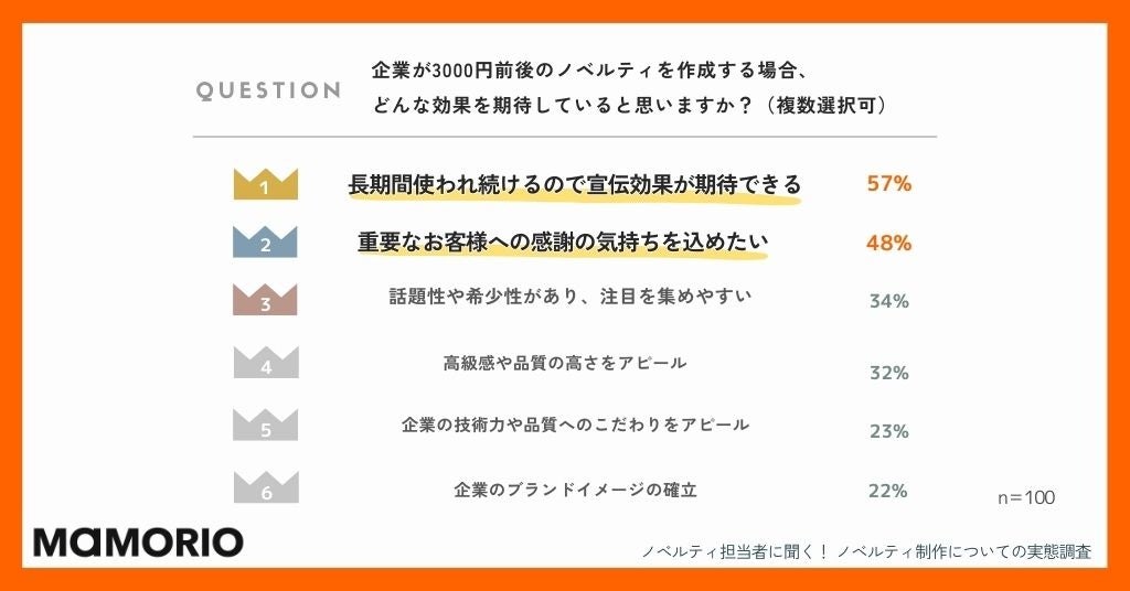 今回の調査では、「企業が3000円前後の比較的高価なノベルティグッズを作成する際に、どのような効果を期待しているのか」の設問を設けました。