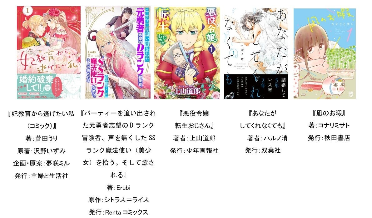 各ジャンルのラインナップは、少女漫画では、胸キュンなドタバタラブコメ『妃教育から逃げたい私(コミック)』。少年漫画では、異世界ものづくりライフで人気の『魔導具師ダリヤはうつむかない ~Dahliya Wilts No More~』。またヤングレディースからは、リアルな大人の恋愛事情が描かれていると話題の『あなたがしてくれなくても』などが選ばれています。その他の作品についてはぜひ、特集ページから確認してみてください!