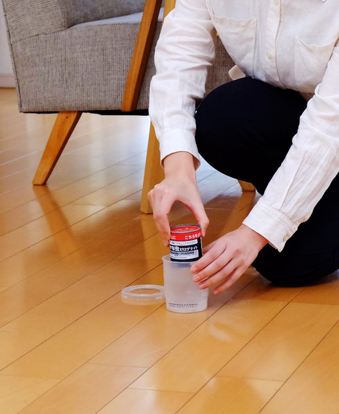 (2)容器からアルミ袋を取り出し、容器の点線まで水を入れ、部屋の中央付近に置きます。アルミ袋から缶を取り出し、缶の赤いシール面を上にして入れ、リング状のフタをします。