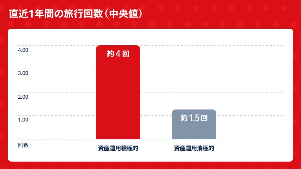 直近1年間の旅行回数と資産運用の実施状況を分析したところ、旅行頻度が高い層ほど資産運用を積極的にしていることが明らかになりました。資産運用に積極的な方の旅行回数(中央値)は年間4.0回に対して消極的な方の旅行回数(中央値)は年間1.5回であり、積極的な方が2.67倍多く旅を楽しんでいる結果が出ました。
