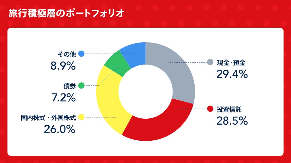 日本人の金融資産構成(※)は「預金」が最も多く、全体の4割近くを占めており、次いで株式投資、投資信託と、資産形成は「貯金」がメインの方法となっています。一方で、本結果をみると旅行積極層は、「預金」を含めたポートフォリオでも、預金に加えて、分散的に投資に取り組んでいることがうかがえます。