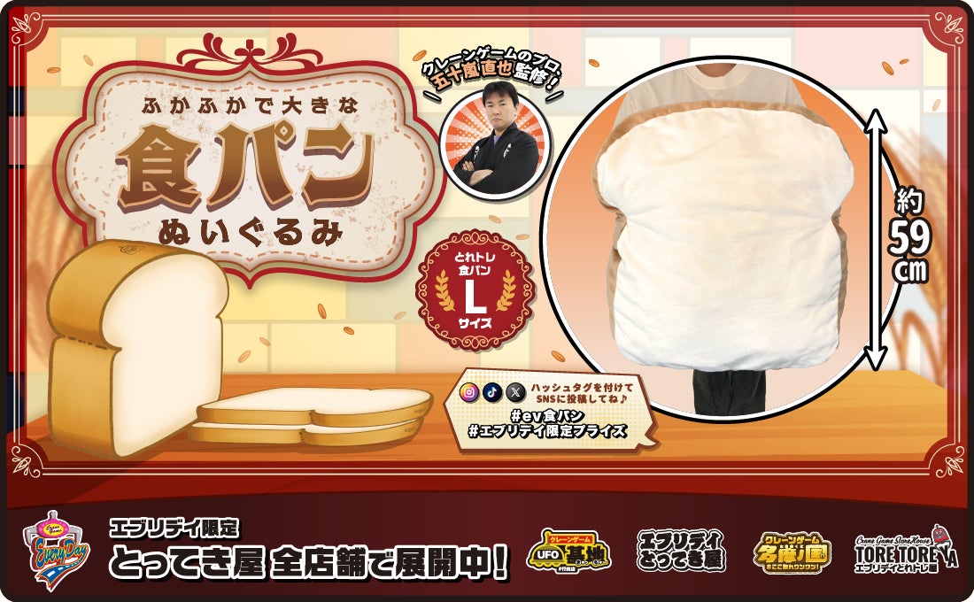 クレーンゲームのプロ・五十嵐直也氏監修のもと誕生した本商品は、思わず抱きしめたくなるボリューム感と、焼きたて食パンのようなリアルなフォルムが魅力の特大サイズぬいぐるみです。サイズは約59cmと存在感抜群のビッグサイズで、クッションとしても使用できるほどのふかふかとした手触りに仕上げました。