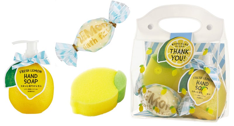 レモンのフォルムが楽しいハンドソープ、レモンケーキのようなバスフィズ(入浴料)、レモン型のスポンジのセット。レモン柄のビニールバッグはジムや温泉などでも活躍しそう。