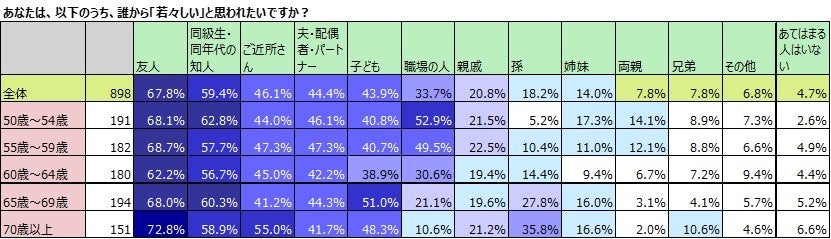 「若々しい」と見られたい対象は、「友人」・「同級生・同世代の知人」・「ご近所さん」の順。