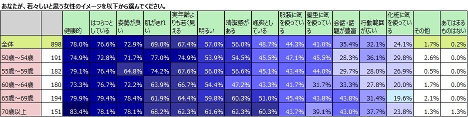 「いつまでも若々しくいたい」や、人から「若々しいと見られたい」を選んだ女性のうち898人に、「若々しい」と思う女性のイメージについて選んでいただきました。1位は「健康的」で、78%と約8割の女性が選んでいます。2位は「はつらつとしている」76.6%で、約8割です。ともに、具体的な外観というよりもイメージのワードが選ばれています。直接的な外観に関わるイメージのワードでは、3位に「姿勢が良い」72.9%でした。それに続くのは「肌がきれい」で、69.0%と約7割でした。顔に関わるイメージの選択肢は、「肌がきれい」以外に、「化粧に気を使っている」がありましたが、24.1%で、選択肢の中では最も少ない結果となりました。イメージや外観以外のイメージワードで選ばれていたのは、「会話・話題が豊富」が挙げられます。この選択肢は、年齢が上がるにつれて選ばれている割合が増えている傾向があります。