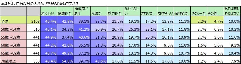 ご自身がどうありたいかという問いに「いつまでも健康でいたい」や「いつまでも若々しくいたい」が選ばれるのは予想できていましたが、それに続く3位に「いつまでも自分らしくいたい」が選ばれており、年齢が高いほど、その割合が高かった事は意外でした。また、「いつまでもかわいらしくいたい」は、70歳以上では13.6%で、人から「かわいらしい」と見られたいのも11.5%のみです。一般的に、高齢者を誉める言葉として「かわいらしいおばあちゃん」や「かわいいおばあちゃん」というような言葉がありますが、あてはまらない女性の方が多いことがわかりました。「かわいらしい」よりも「魅力的だ」と見られたい女性の方が多いことから、自立した個人であることの方が望まれているのではないかと考えます。そもそも、「かわいらしい」という対象は、愛すべき表現ですが、幼いもの・小さなものなどに使われることが多いことからも、高齢者には、そぐわない言葉なのかもしれません。