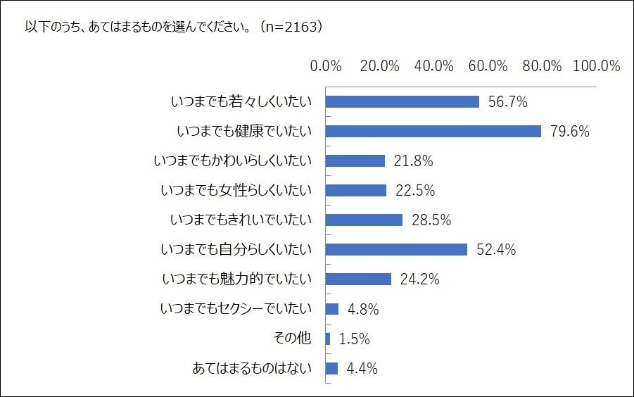 全国の50歳以上の女性2,163人に、これからのご自身について聞きました。「いつまでも〇〇でいたい」(〇〇はイメージ)のうち、あてはまるものを選んでもらいました。(複数選択のため、合計が100%にはなりません。)最も多かったのは、「健康でいたい」で、全体では79.6%と約8割。年齢が上がるほどに、少しづつ割合が増え、60代を超えると、8割よりも多い人が選んでいます。2位は、「若々しくいたい」で、56.7%と約6割。こちらは、年齢による差はほとんど見られません。3位の「自分らしくいたい」は、52.4%で約5割ですが、こちらは、60歳を超えると、年齢を重ねるほど割合が増え、最も多い割合の女性が選んでいるのは、70歳以上の女性です。「きれいでいたい」や「魅力的でいたい」、「かわいらしくいたい」は、年齢を重ねるほど、あてはまらない人が多い結果となりました。