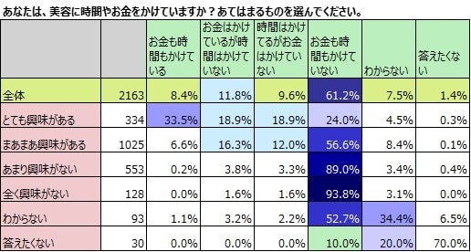 また、美容への関心度と、美容に関する時間やお金のかけ方について、掛け合わせて見てみました。美容に「とても興味がある」と答えた女性は、「お金も時間もかけている」のが、33.5%です。「お金はかけているが、時間はかけていない」18.9%と合わせると、52.4%に上り、美容にとても興味がある女性は、半数以上の女性が、お金をかけて美容に取り組んでいることがわかります。美容に「全く興味がない」と答えた女性は、93.8%が、「お金も時間もかけていない」と答えています。