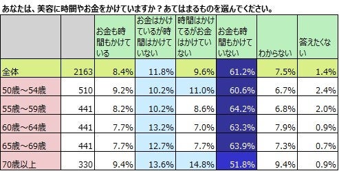 50歳以上の女性2000名の美容意識調査。美容にかけているのは、「時間よりもお金」が多数派。