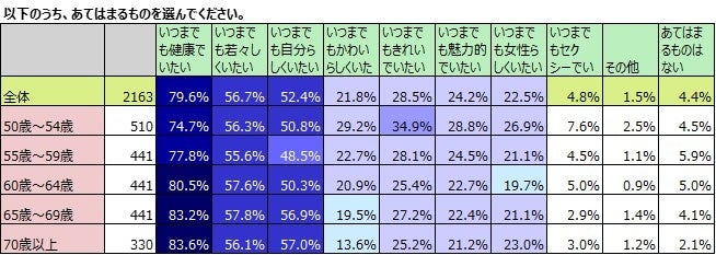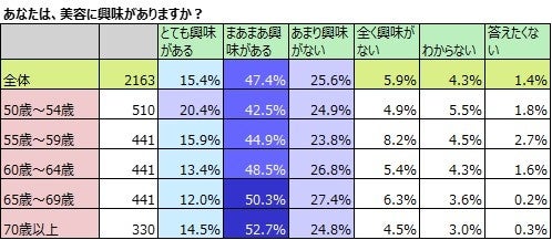 インターネットを利用しての調査であるため、自分でインターネットの操作が可能で、アンケートに答えられる人という条件下ではありますが、美容に関する意識のエイジレス化や、高齢であっても自立している女性の価値観が伺える興味深い結果となりました。