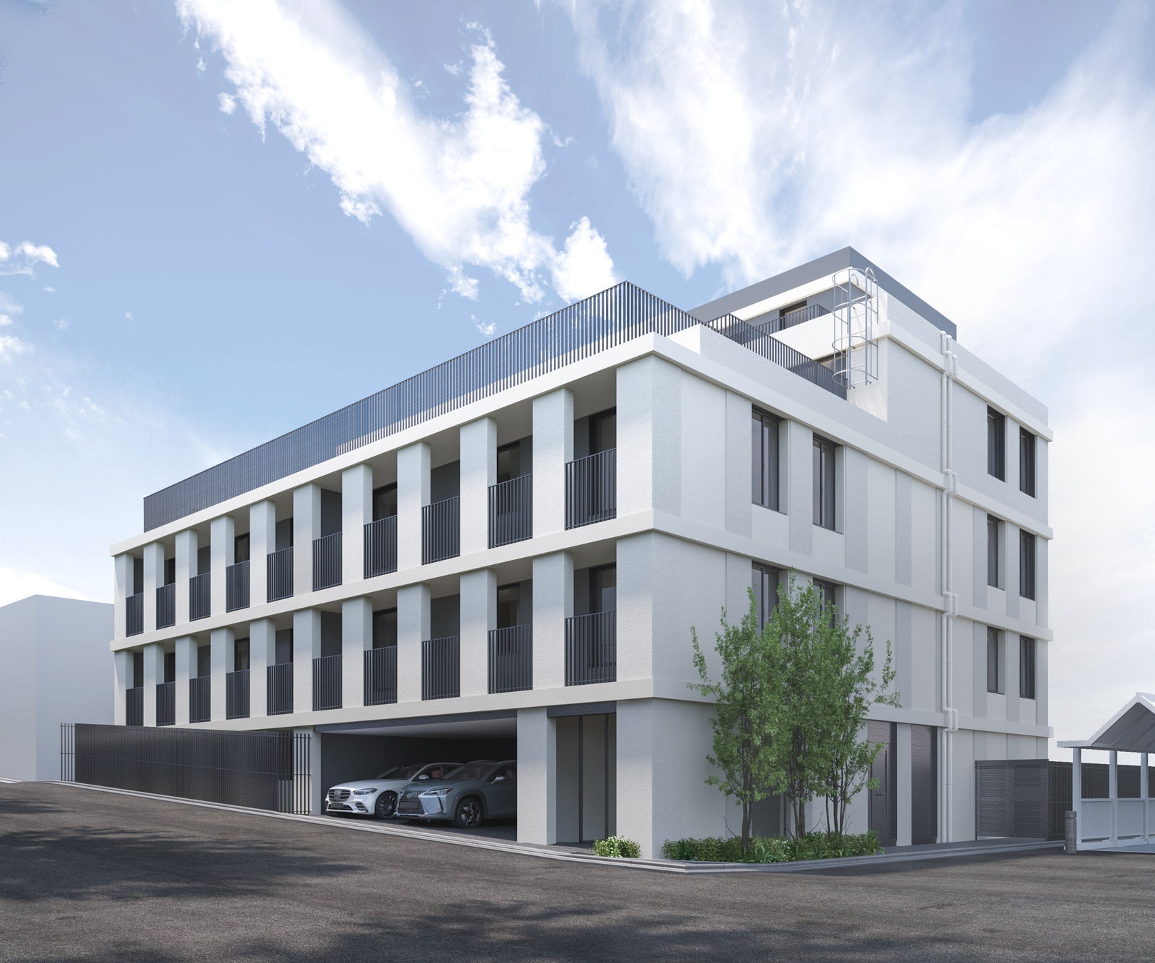 公園や学校が多く、緑豊かな環境に施工中の物件です。外観は明るく温かみのある仕上げを施しつつ重厚で存在感のあるデザインとし、街並みを牽引するような建物となることを目指しています。間取りはルーフバルコニー付やメゾネットタイプなど、多様なライフスタイルに対応できる物件となっております。