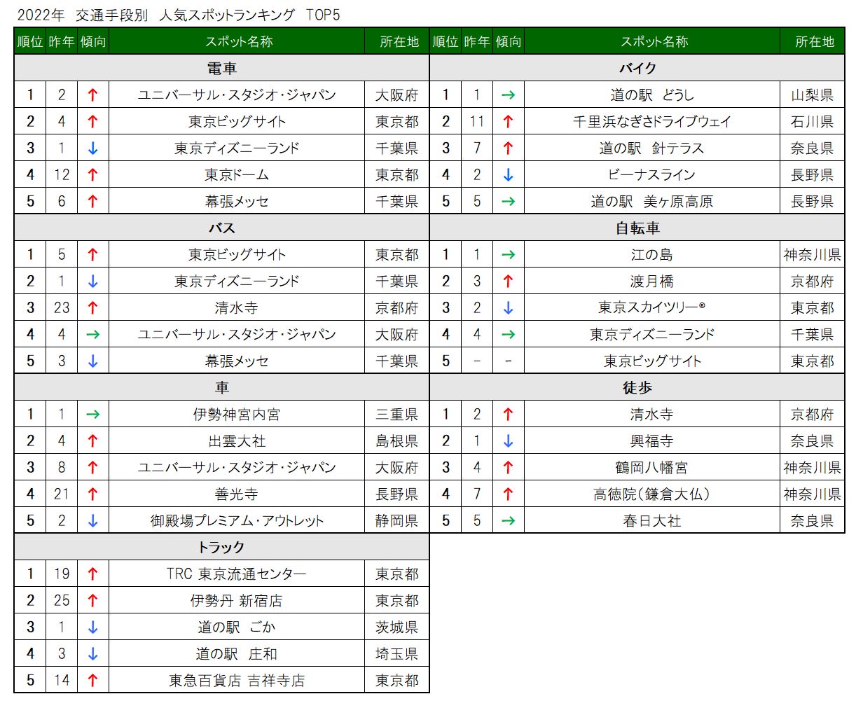 ・『交通手段別 人気スポットランキング』TOP30 (電車、バス、車、トラック、バイク、自転車、徒歩)