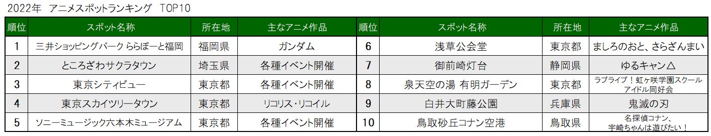 今年のアニメ関連ランキングは、アニメの舞台となったスポットに加え、アニメ関連のコラボイベントが開催されたスポットを独自に調査し、対象範囲を拡大して集計しました。全国各地でイベントが少しずつ再開されていることからイベント開催スポットが上位にランクインしました。また、昨年までは公園や屋外の観光スポットが多くランクインしていましたが、今年はショッピングモールや商業ビルなど街中のスポットが並ぶのも特徴です。