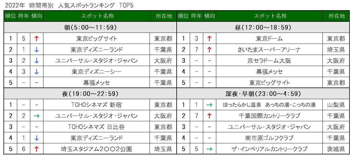 どの時間帯も、半数が入れ替わったのが今年の最大の特徴です。朝はテーマパークに加えてイベントホール/公会堂が新たに多くランクインしました。昼はイベントホール/公会堂とスタジアム/球場、夜は映画館、深夜・早朝はゴルフ場と、時間帯による特徴が顕著に出る結果となりました。夜のランキングでは、一昨年まで定番だった映画館が昨年は1件となっていましたが、今年は5件とまた増加しています。