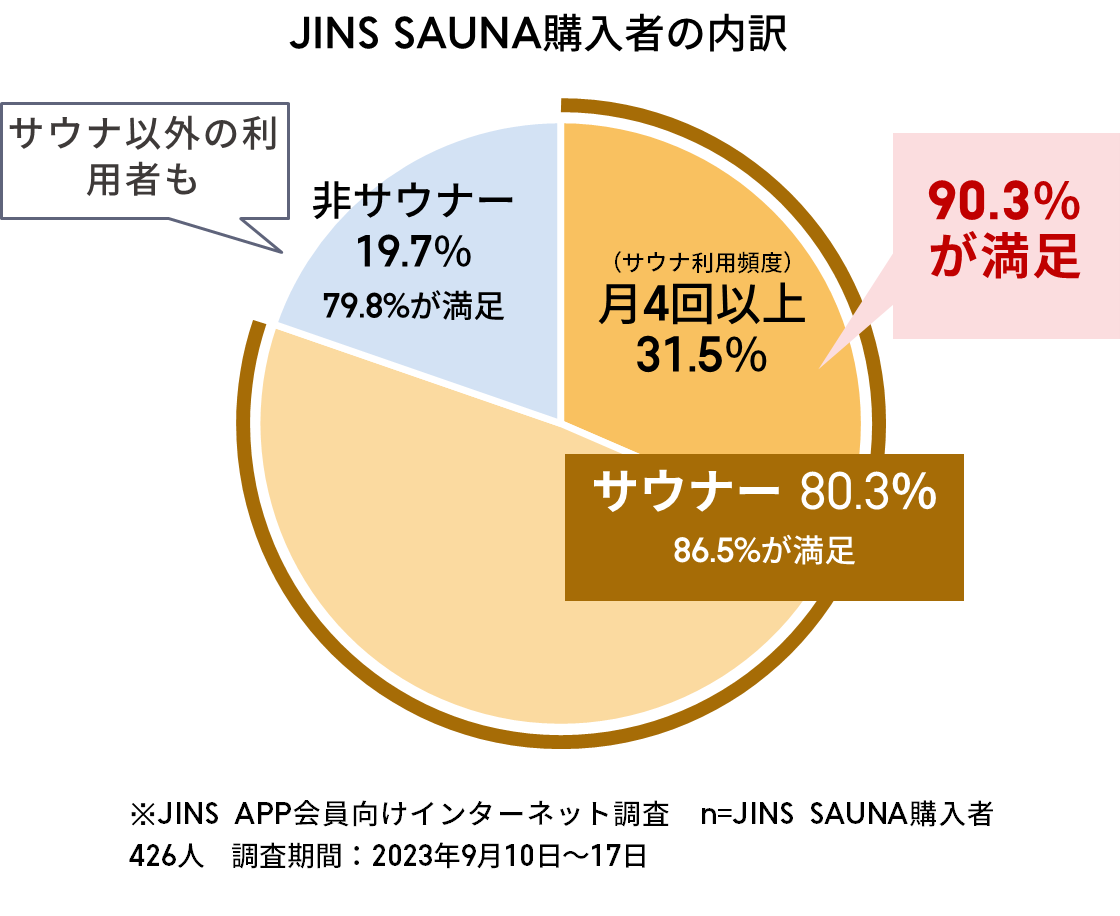 ※月に4回以上サウナに行くサウナーのうち商品に対して「満足」と回答した方の割合が90.3%であることを指す