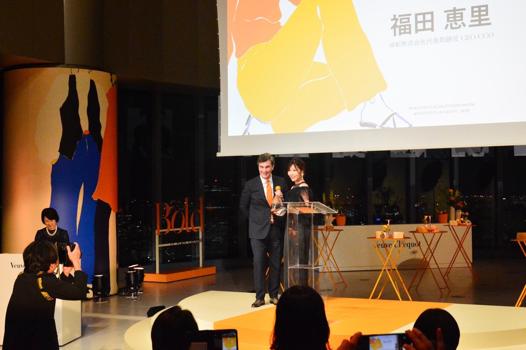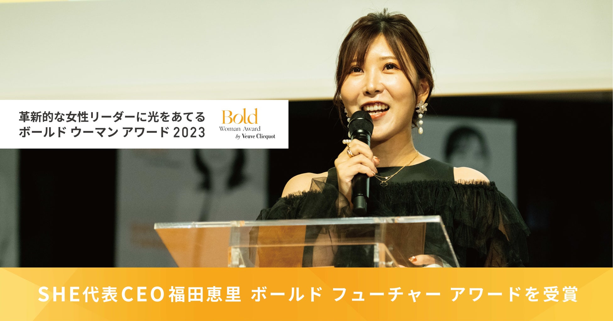 SHE代表取締役CEO/CCOの福田恵里は3名のファイナリストの中から、新規性をもった取り組みにより、これからの活躍がより期待される次世代の女性リーダーに贈られる「Bold Future Award(ボールド フューチャー アワード)」を受賞しました。