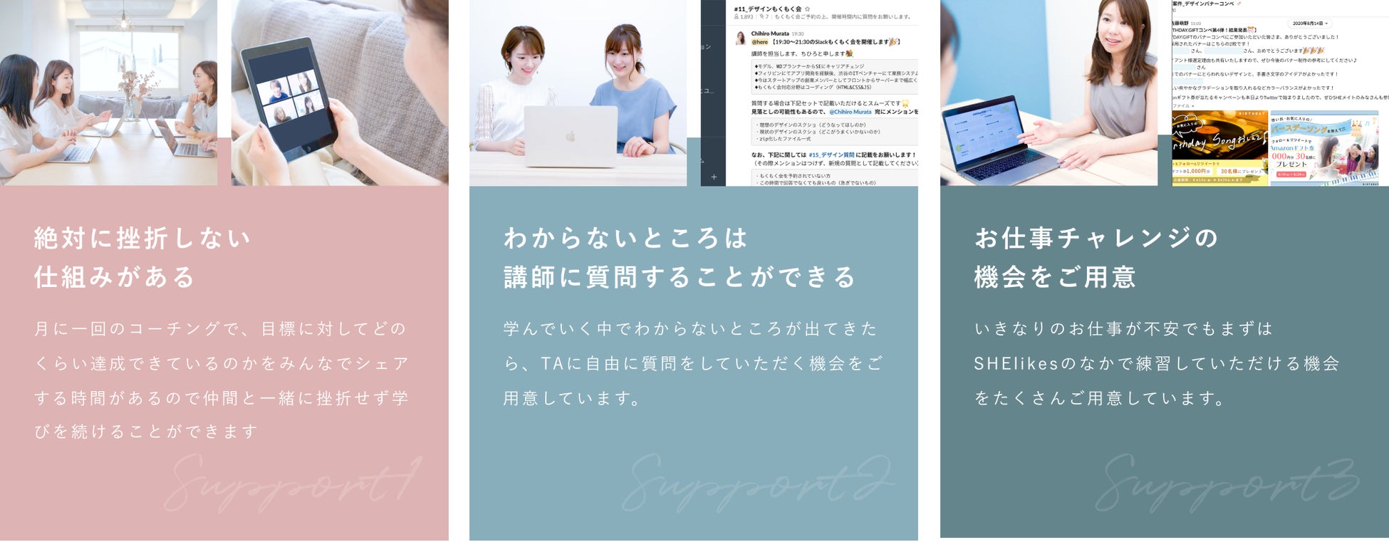 パソコンやスマートフォンなどオンラインで視聴できるコース動画、コーチングやティーチング、同じ目標や趣味嗜好で集まれるコミュニティをはじめとした学び続けられる手厚いサポート、SHElikes内で挑戦できるお仕事案件など、学びをすぐに仕事として生かすことができるのが特徴です。